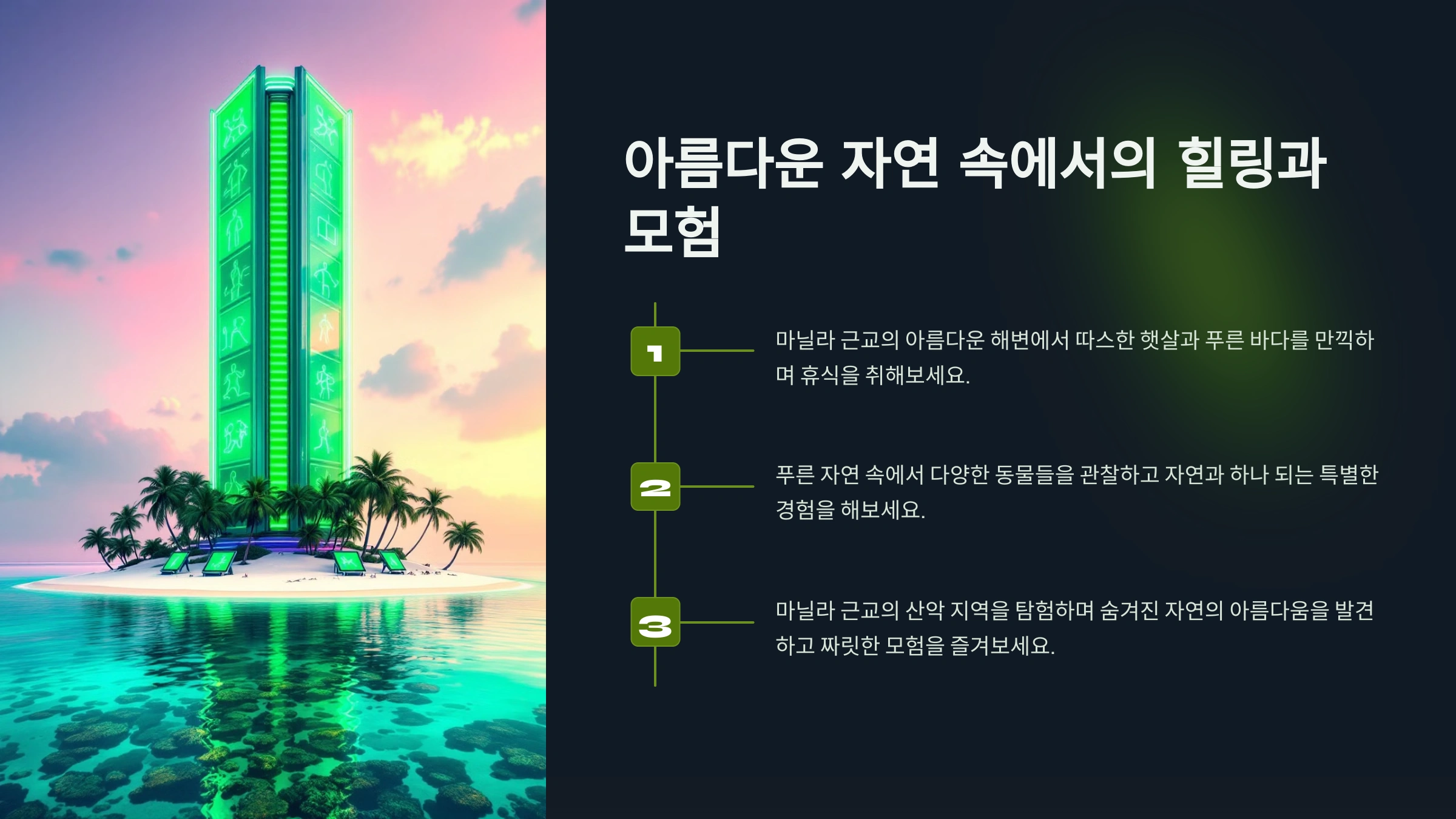 자연 속에서의 휴식은 여행의 피로를 풀어줄 뿐만 아니라, 새로운 에너지를 충전시켜줄 거예요. 마닐라와 그 주변의 자연을 꼭 경험해 보세요.