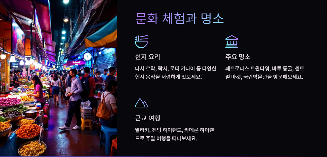쿠알라룸푸르는 페트로나스 트윈타워로 대표되는 현대적 도시의 이미지를 갖추고 있지만, 동시에 이슬람, 중국, 인도 문화가 혼합된 독특한 전통이 살아 있습니다. 관광 명소와 더불어 도시 전역에서 다양한 음식을 저렴하게 즐길 수 있어 장기 체류에도 지루함이 없습니다.