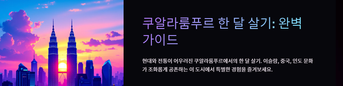 쿠알라룸푸르는 동남아시아의 매력적인 도시로, 현대적인 도시와 전통적인 문화가 조화롭게 공존합니다. 한 달이라는 시간 동안 쿠알라룸푸르에 머무른다면, 다양한 문화 체험과 맛있는 음식, 편리한 생활 환경 속에서 풍부한 경험을 누릴 수 있습니다.