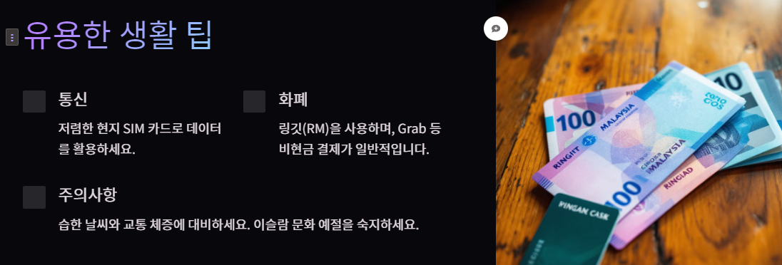 말레이시아 화폐인 링깃(RM)을 사용합니다. 주요 은행 ATM에서 인출할 수 있으며, 환율이 좋은 환전소를 찾는 것도 추천합니다. Grab 같은 앱과 현금 없이도 결제 가능한 서비스가 많아 매우 편리합니다.