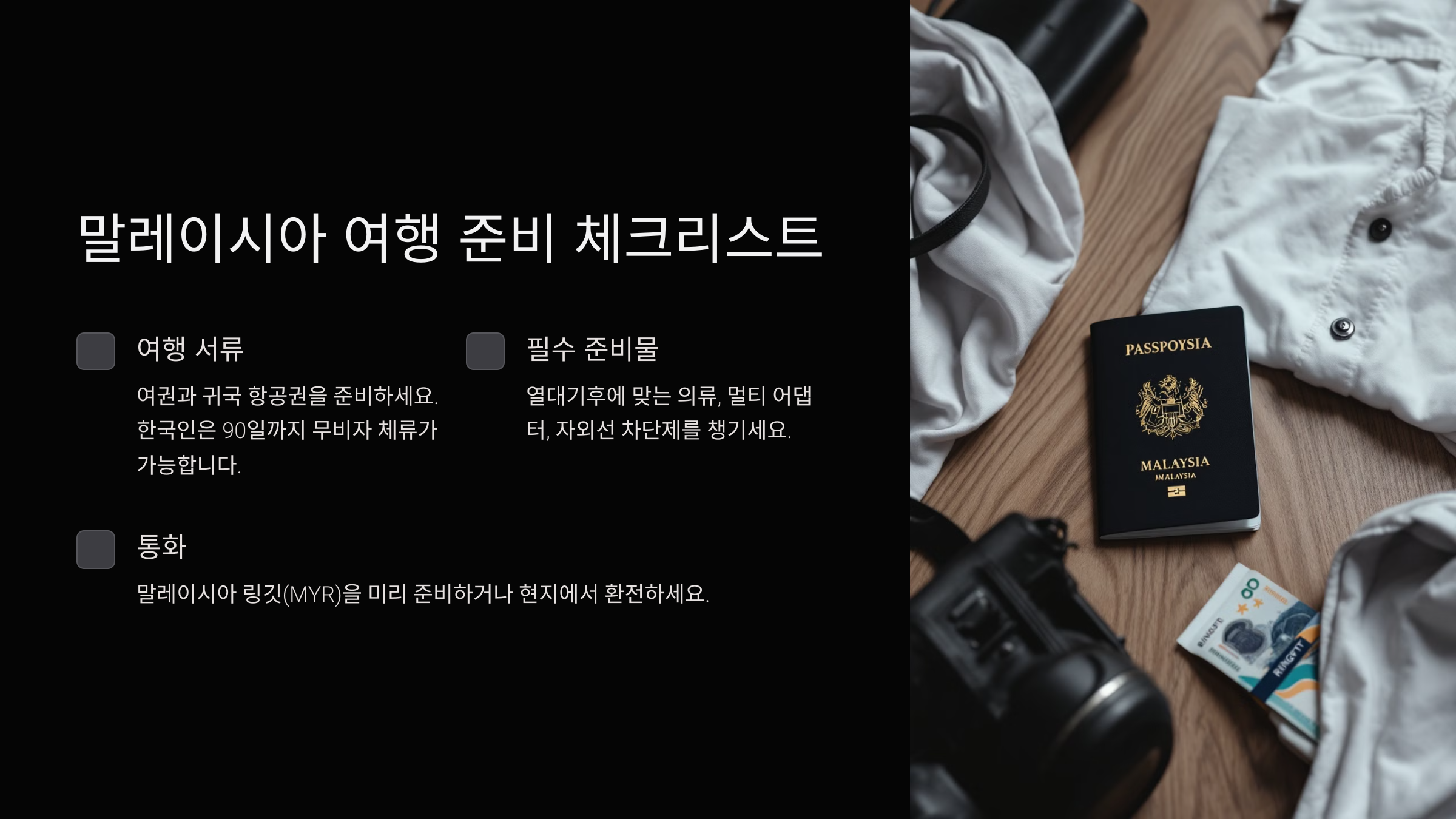 말레이시아는 열대기후로 따뜻한 날씨가 이어지는 곳입니다. 여행을 떠나기 전, 준비물을 챙겨가는 것이 자유여행의 첫걸음입니다.