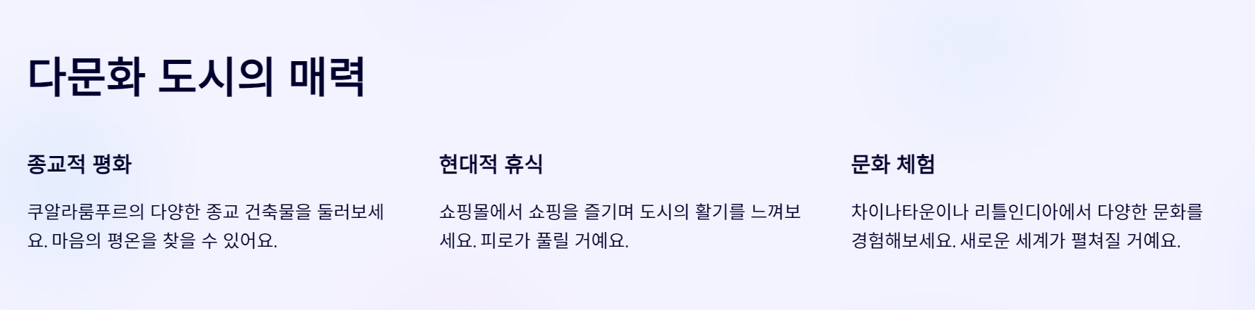 말레이시아는 다양한 문화와 종교가 공존하는 국가로, 힐링 여행에서도 그 매력을 발견할 수 있습니다. 쿠알라룸푸르에서는 모스크, 사원, 교회 등 종교적 건축물을 탐방하며 마음의 안정을 찾을 수 있습니다. 또한, 쇼핑과 현대적 시설이 어우러진 도시의 편안함은 여행 중 지친 몸을 풀어줍니다.