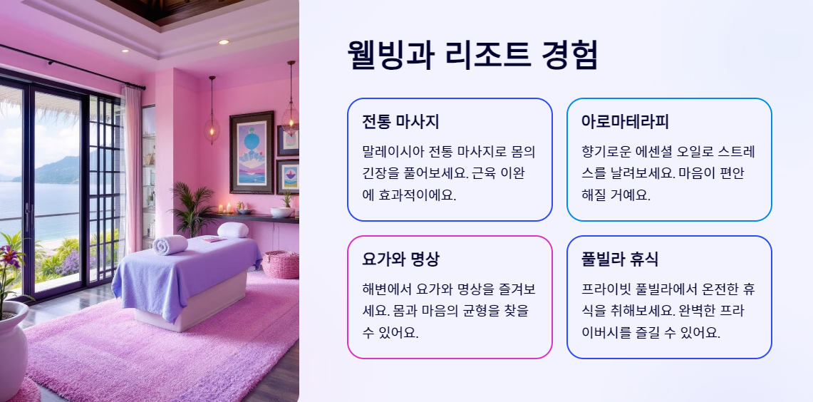 말레이시아는 고급 리조트와 웰빙 프로그램으로도 유명합니다. 랑카위와 페낭의 리조트에서는 수준 높은 스파 서비스를 제공하며, 말레이시아 전통 마사지와 아로마테라피를 경험할 수 있습니다. 또한, 요가와 명상 수업은 몸과 마음의 균형을 되찾는 데 큰 도움을 줍니다.