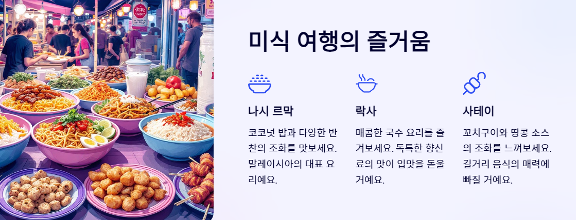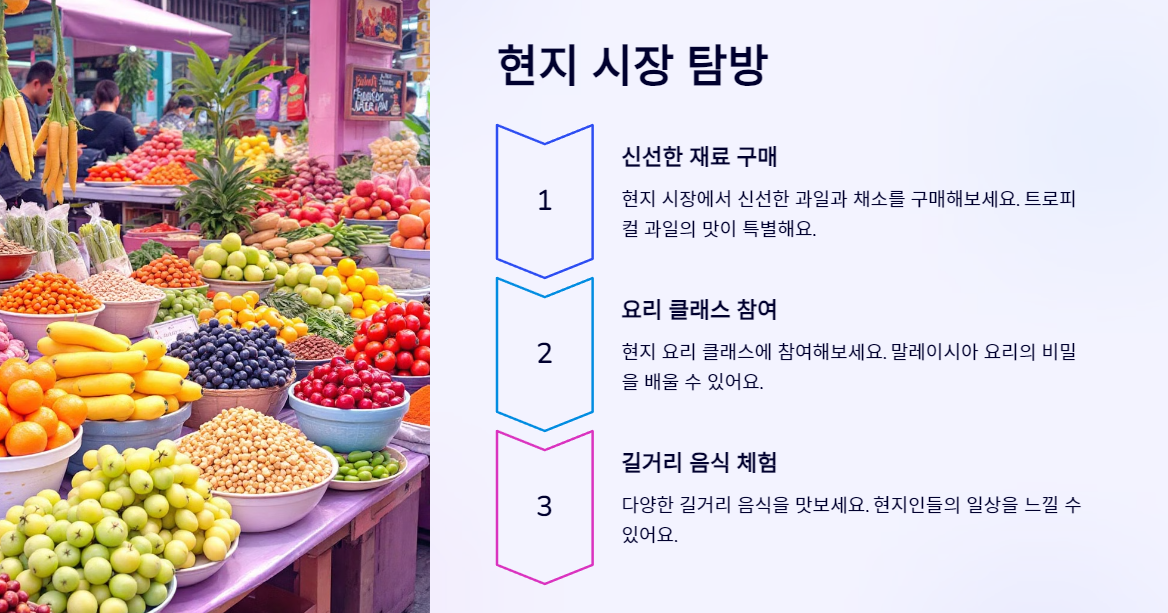 힐링 여행에서 음식은 빼놓을 수 없는 요소입니다. 말레이시아에서는 나시르막, 락사, 사테이 등 다양한 요리를 즐길 수 있습니다. 로컬 시장에서 신선한 재료로 만든 음식을 맛보며 소소한 행복을 느낄 수 있습니다.