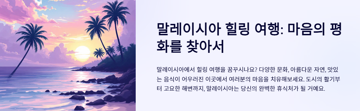 말레이시아는 다양한 문화와 자연 경관이 어우러져 여행자들에게 진정한 힐링을 선사하는 동남아시아의 보석입니다. 이국적인 풍경과 따뜻한 기후, 다채로운 음식은 물론, 고요한 해변부터 울창한 정글까지 마음의 여유를 찾을 수 있는 명소가 가득합니다.