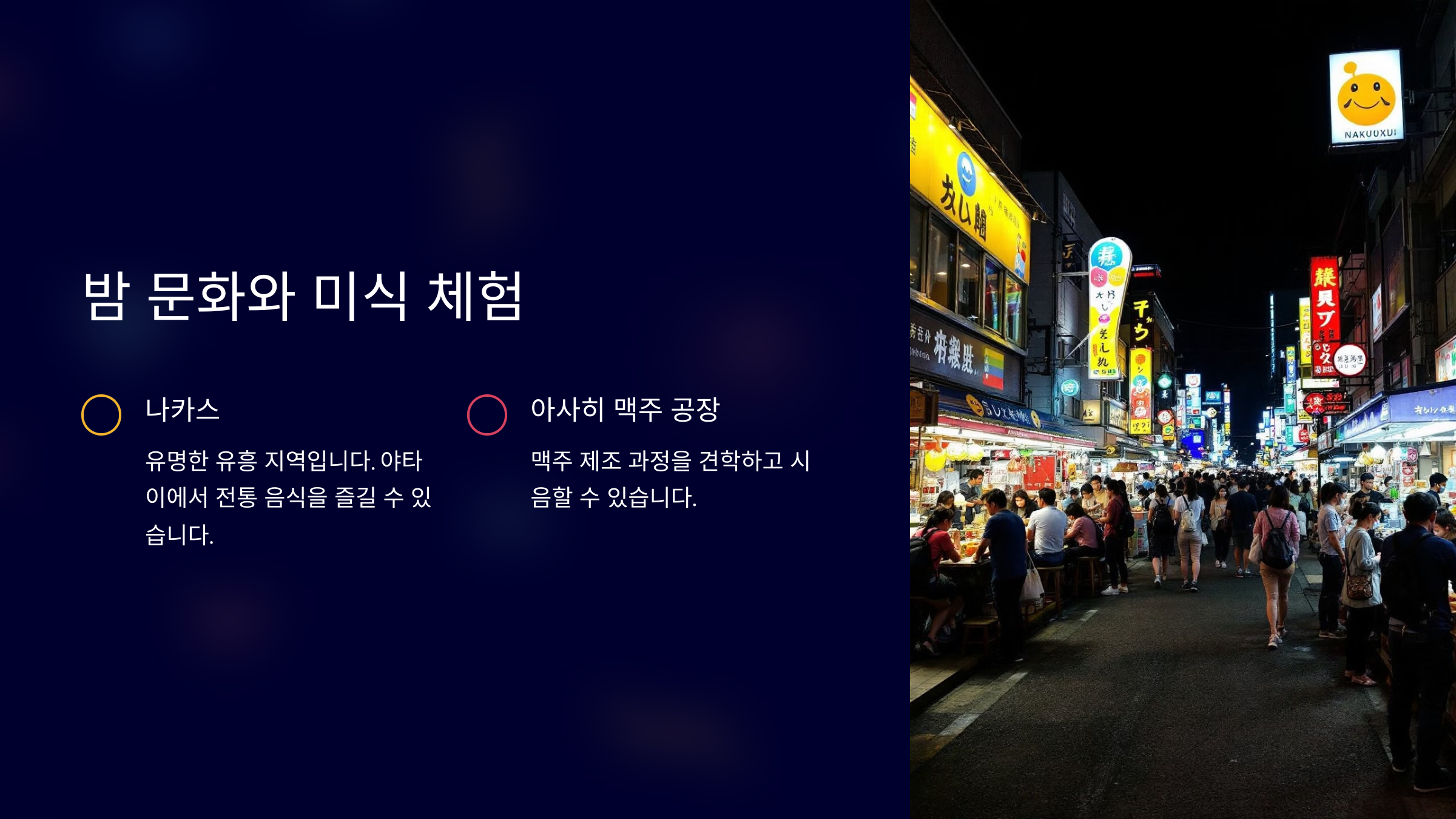후쿠오카의 밤 문화를 제대로 경험하고 싶다면 나카스 지역을 방문해보세요. 나카스는 후쿠오카의 대표적인 유흥가로, 수많은 야타이(포장마차)가 늘어서 있어 다양한 일본 음식을 맛볼 수 있습니다. 라멘, 야키토리, 텐동 등 일본 대표 음식을 즐기며 현지 분위기를 만끽할 수 있는 곳입니다. 특히 나카스 강변을 따라 형성된 포장마차 거리는 밤마다 활기가 넘치며, 일본의 정취를 느끼기에 제격입니다.