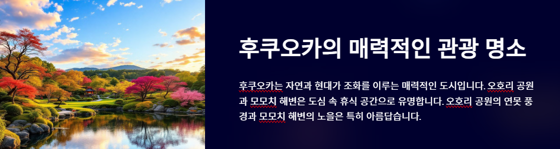 후쿠오카는 일본의 남서부에 위치한 규슈 지방의 중심 도시로, 전통과 현대가 조화를 이루는 매력적인 여행지입니다. 도시의 활기와 아름다운 자연, 맛있는 음식, 풍부한 문화유산이 어우러져 관광객들에게 다양한 즐거움을 선사합니다.