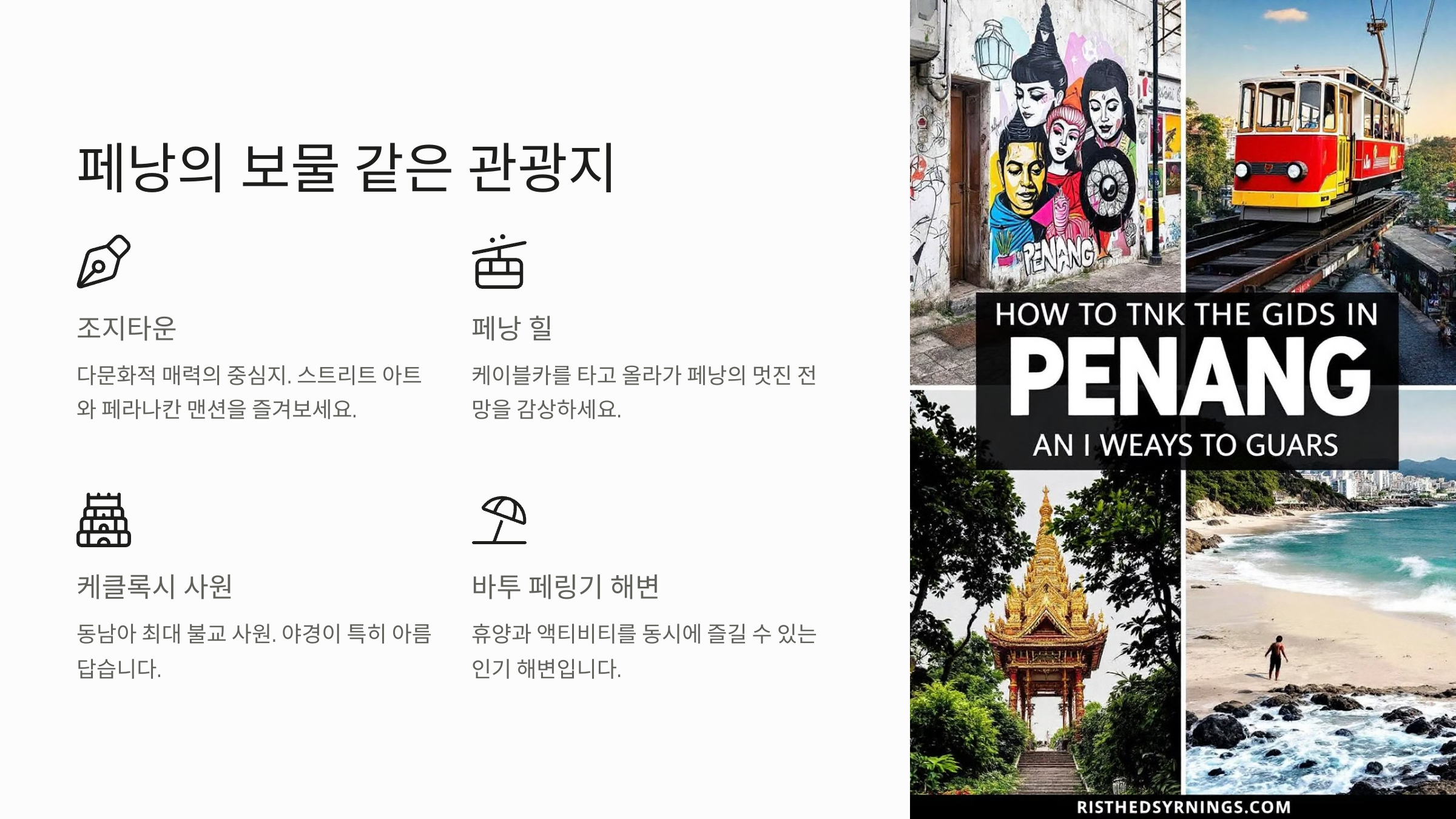 페낭 자유여행을 계획하고 있다면 어디를 가야 할지, 무엇을 먹어야 할지, 어떻게 이동해야 할지 고민될 텐데요. 아래에서 페낭의 다양한 매력을 중점적으로 소개하며 효율적인 여행 계획을 세울 수 있도록 도와드리겠습니다.