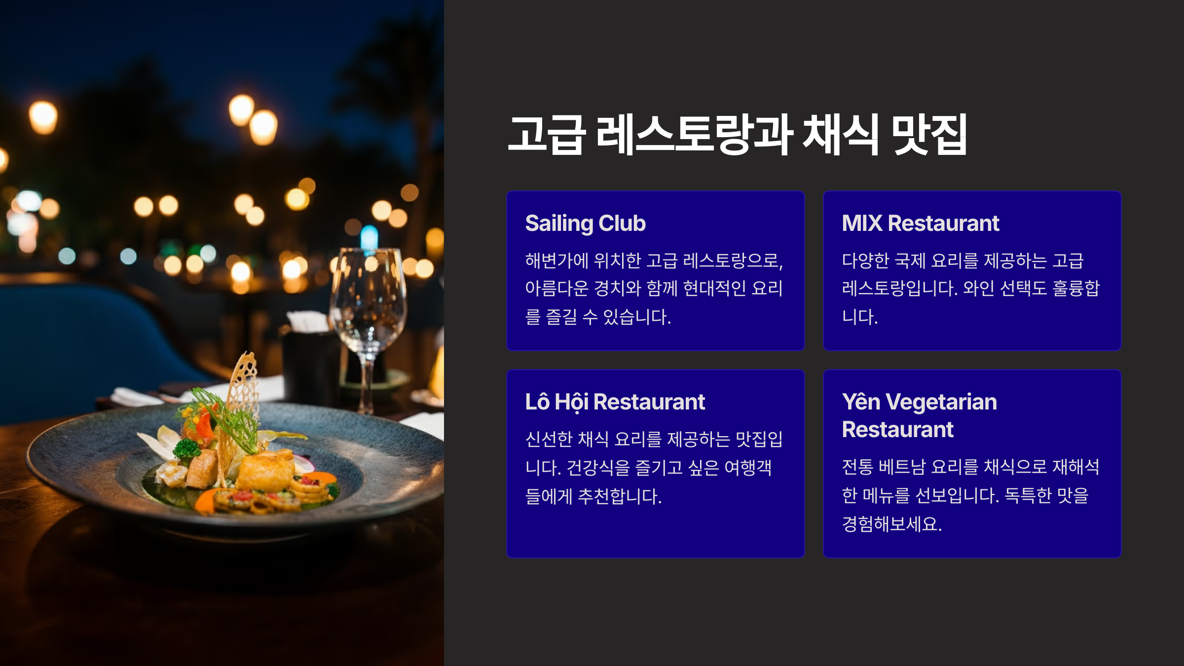 나트랑에는 고급스러운 분위기에서 식사를 즐길 수 있는 레스토랑도 많습니다.