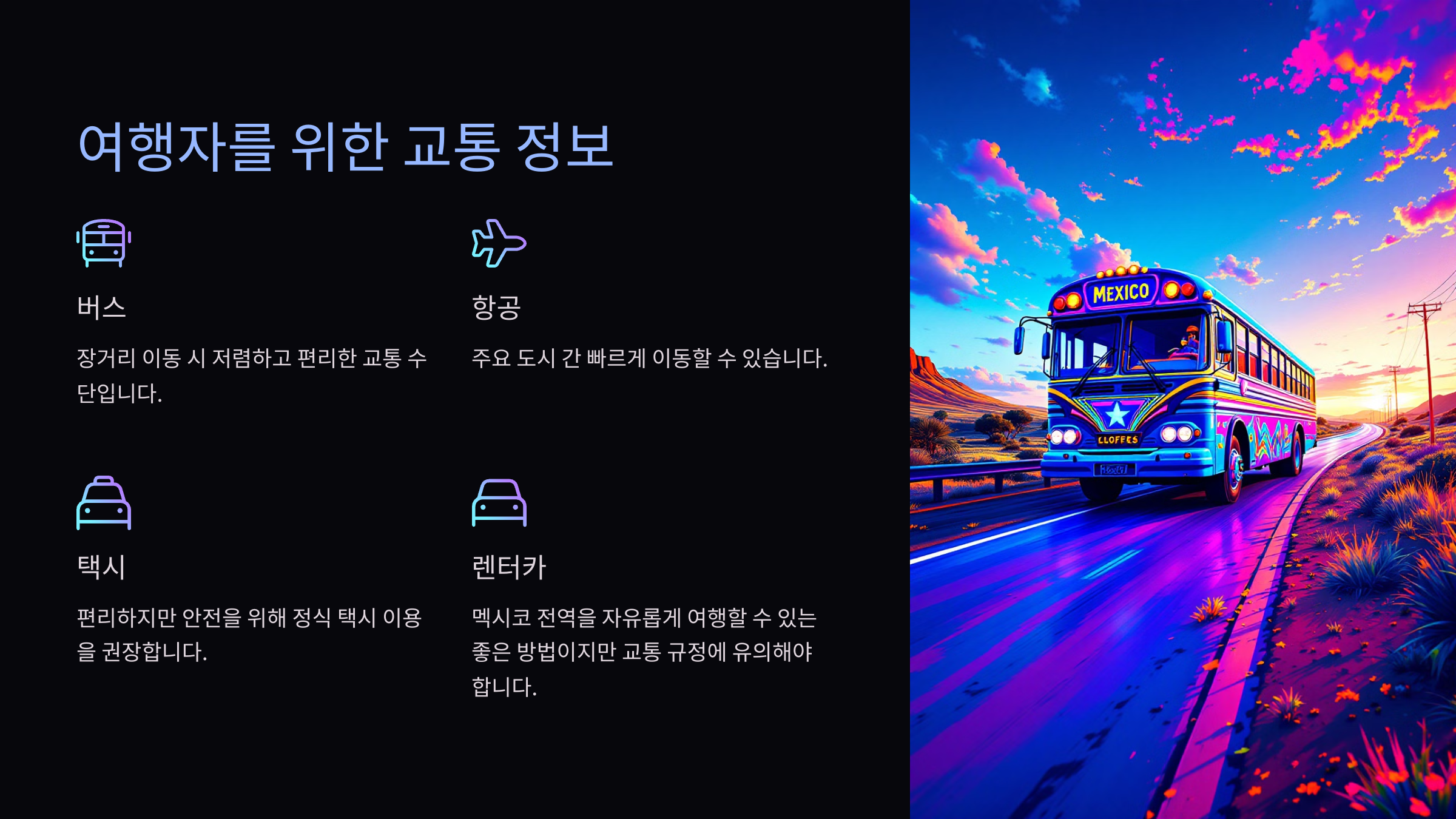 멕시코는 교통 시스템이 비교적 잘 발달되어 있어요. 도시 간 이동은 주로 고속버스를 이용하면 편리하고 경제적이에요. ADO나 ETN 같은 고속버스 서비스는 넓은 좌석과 편안한 환경을 제공해요.