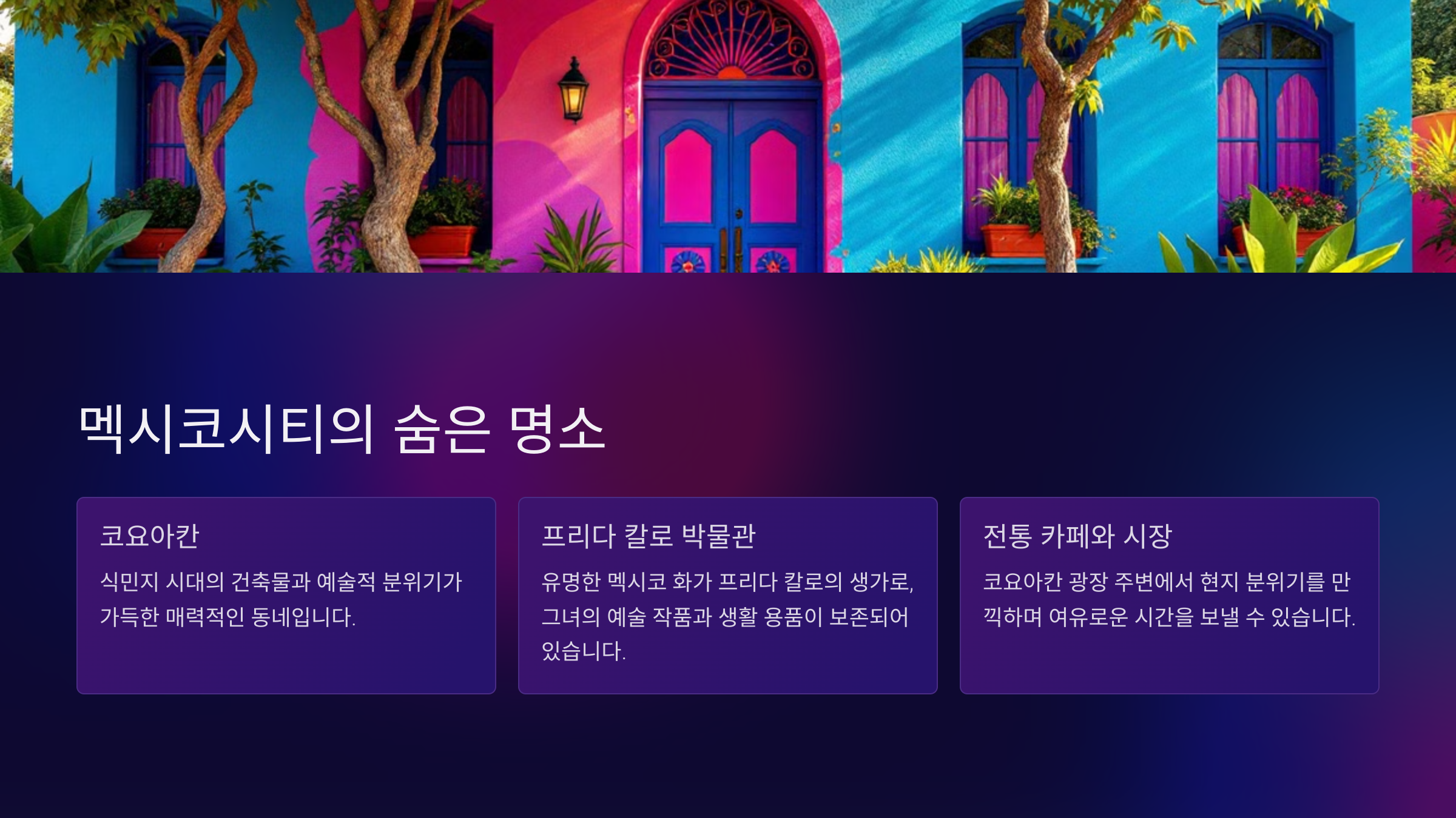 멕시코시티에서 가장 매력적인 동네 중 하나는 코요아칸(Coyoacán) 입니다. 식민지 시대의 건축물과 예술적 분위기가 가득한 이곳은 유명한 멕시코 화가 프리다 칼로(Frida Kahlo) 의 생가가 있는 곳이기도 합니다.