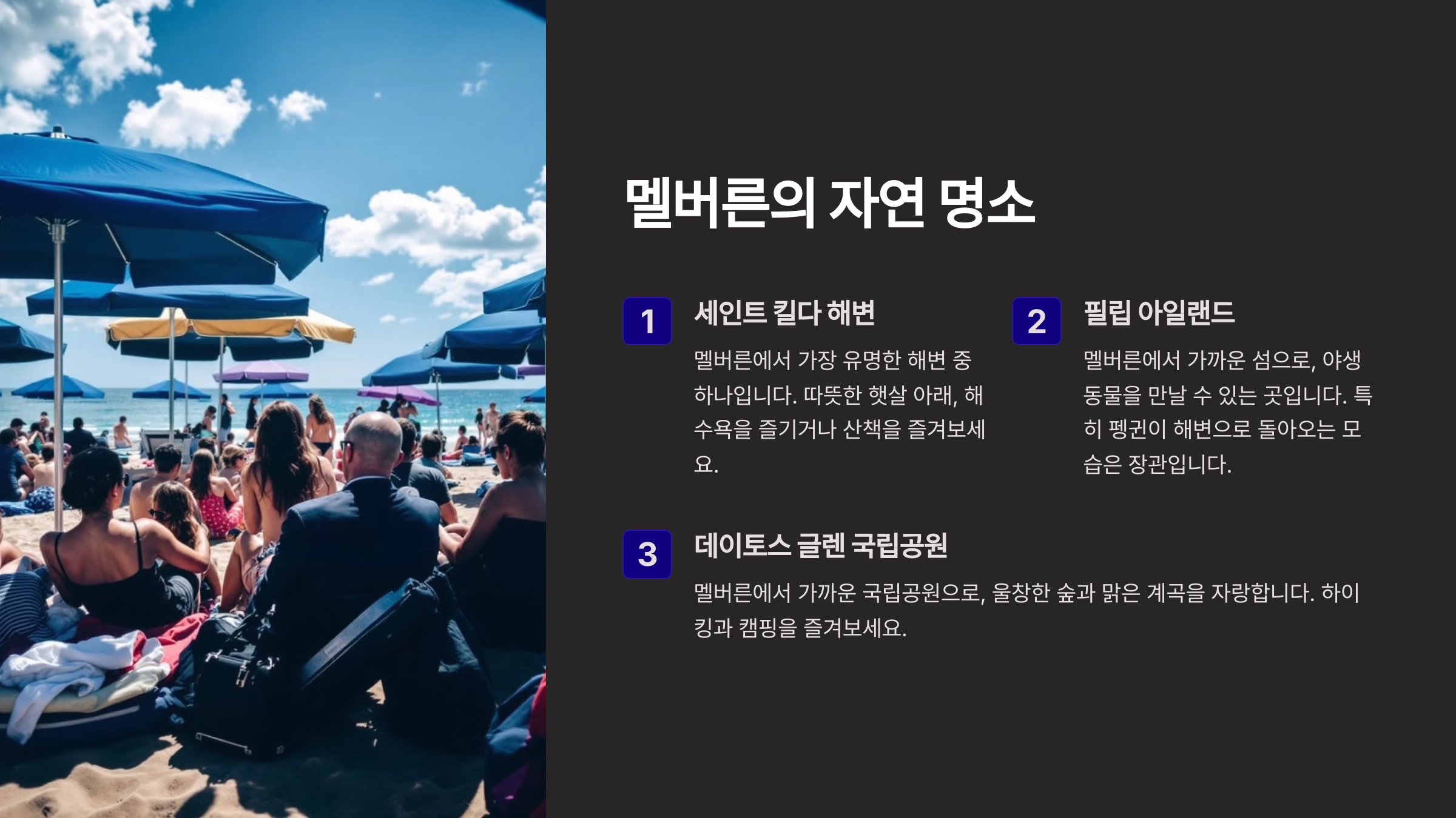 필립 아일랜드(Phillip Island)는 야생 펭귄들이 해변으로 돌아오는 펭귄 퍼레이드로 유명해요. 자연과 동물들을 가까이에서 볼 수 있어 가족 여행으로도 인기가 많아요.