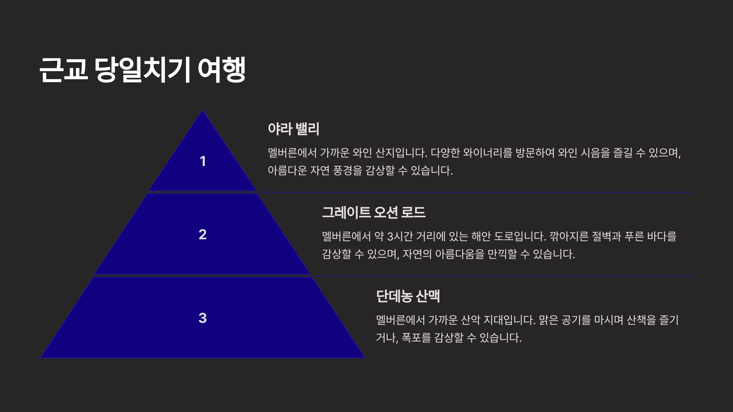 A3. 차량 렌트는 멜버른 공항이나 시내에서 가능하며, 국제 면허증이 필요해요. 그레이트 오션 로드 같은 경우에는 차량 이용이 더 편리해요.