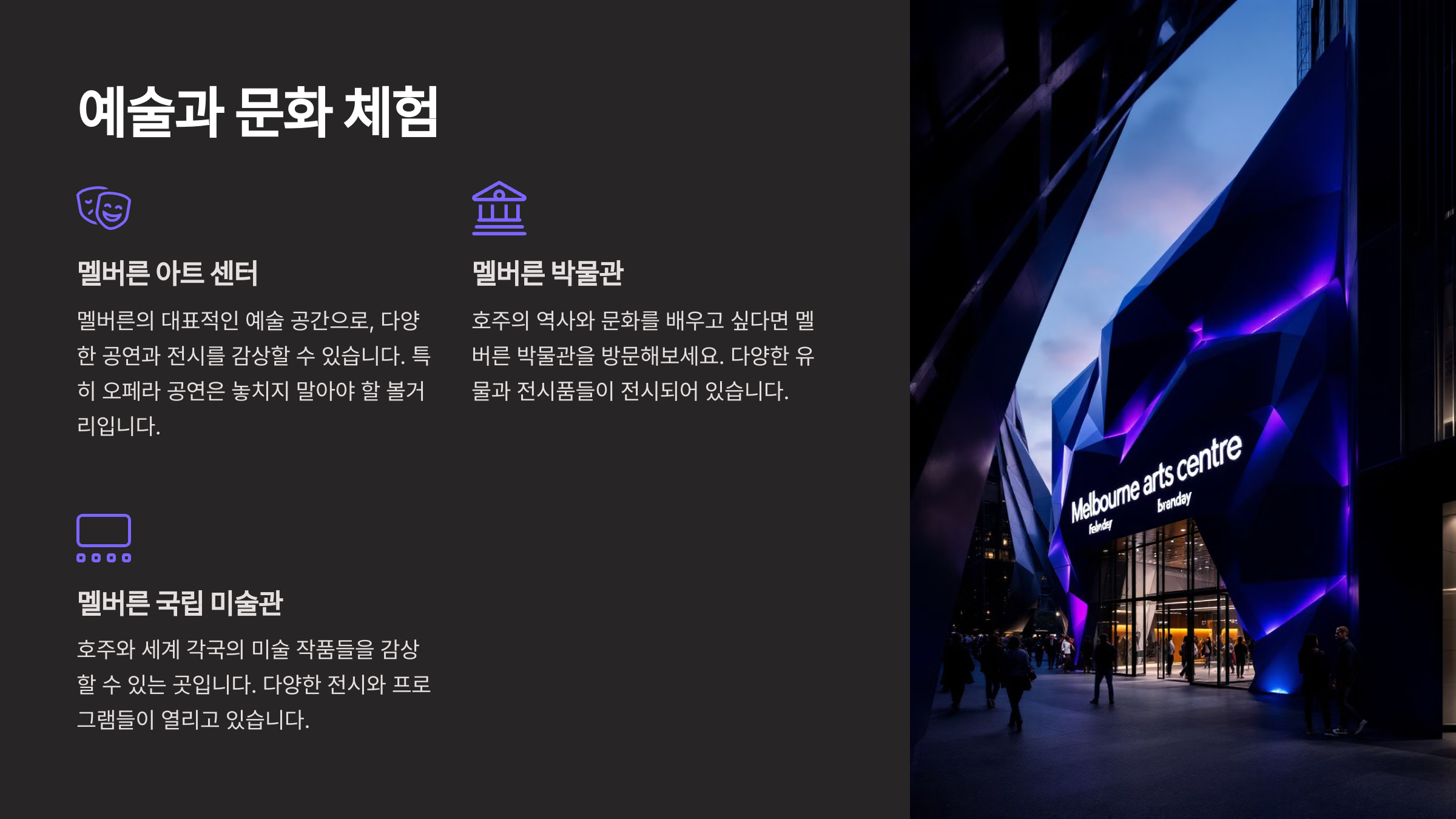 멜버른은 예술과 문화의 중심지로, 세계적인 갤러리와 공연장을 보유하고 있어요. 특히 빅토리아 국립미술관(National Gallery of Victoria, NGV)은 멜버른에서 반드시 방문해야 할 곳 중 하나로, 다양한 현대 미술과 고전 작품들을 감상할 수 있답니다.