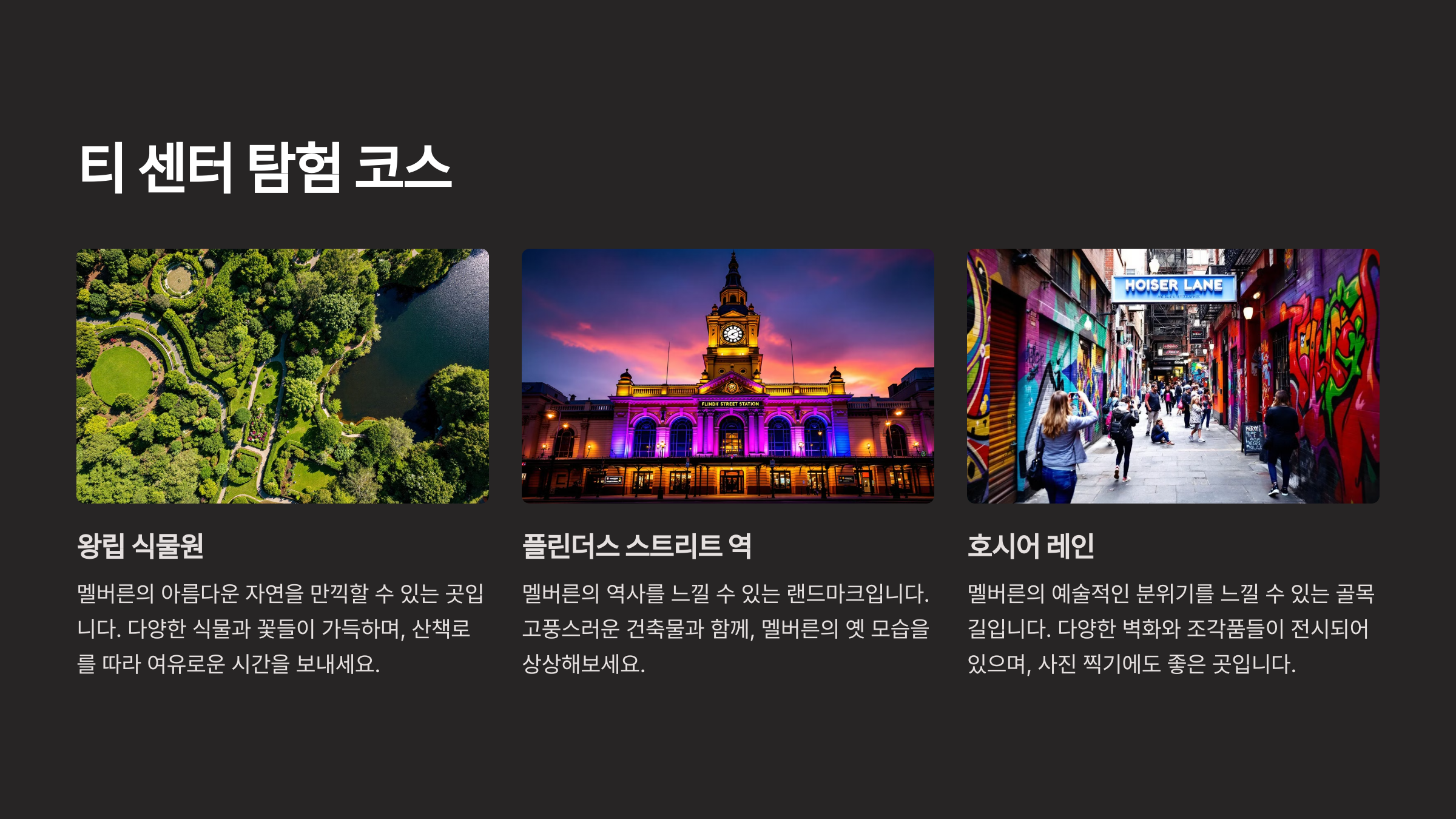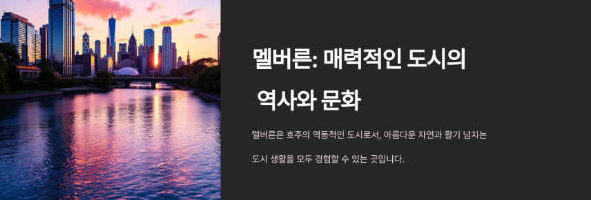 이 도시는 19세기 골드러시 시절에 크게 성장해 독특한 역사적 건축물과 현대적인 도시 풍경이 어우러진 매력을 가지고 있어요. 특히 멜버른의 골목길과 거리 예술은 세계적으로 유명하답니다. 어떤 취향을 가지고 있든, 멜버른은 당신에게 특별한 추억을 선사할 거예요.