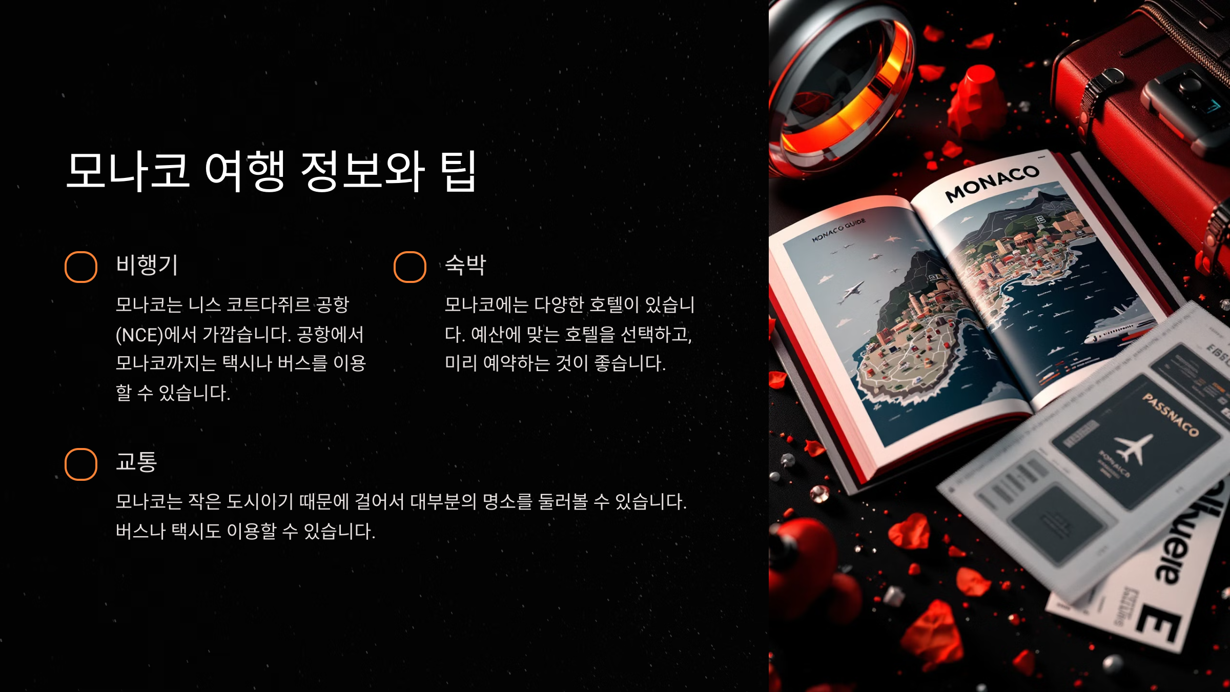 모나코는 면적이 작아서 여행하기에 아주 편리한 도시예요. 대중교통이 잘 발달해 있어서 기차나 버스를 이용하면 주요 관광지를 금방 이동할 수 있어요. 특히 니스 공항에서 모나코까지 이동하는 헬리콥터 서비스는 특별한 경험이 될 수 있답니다.