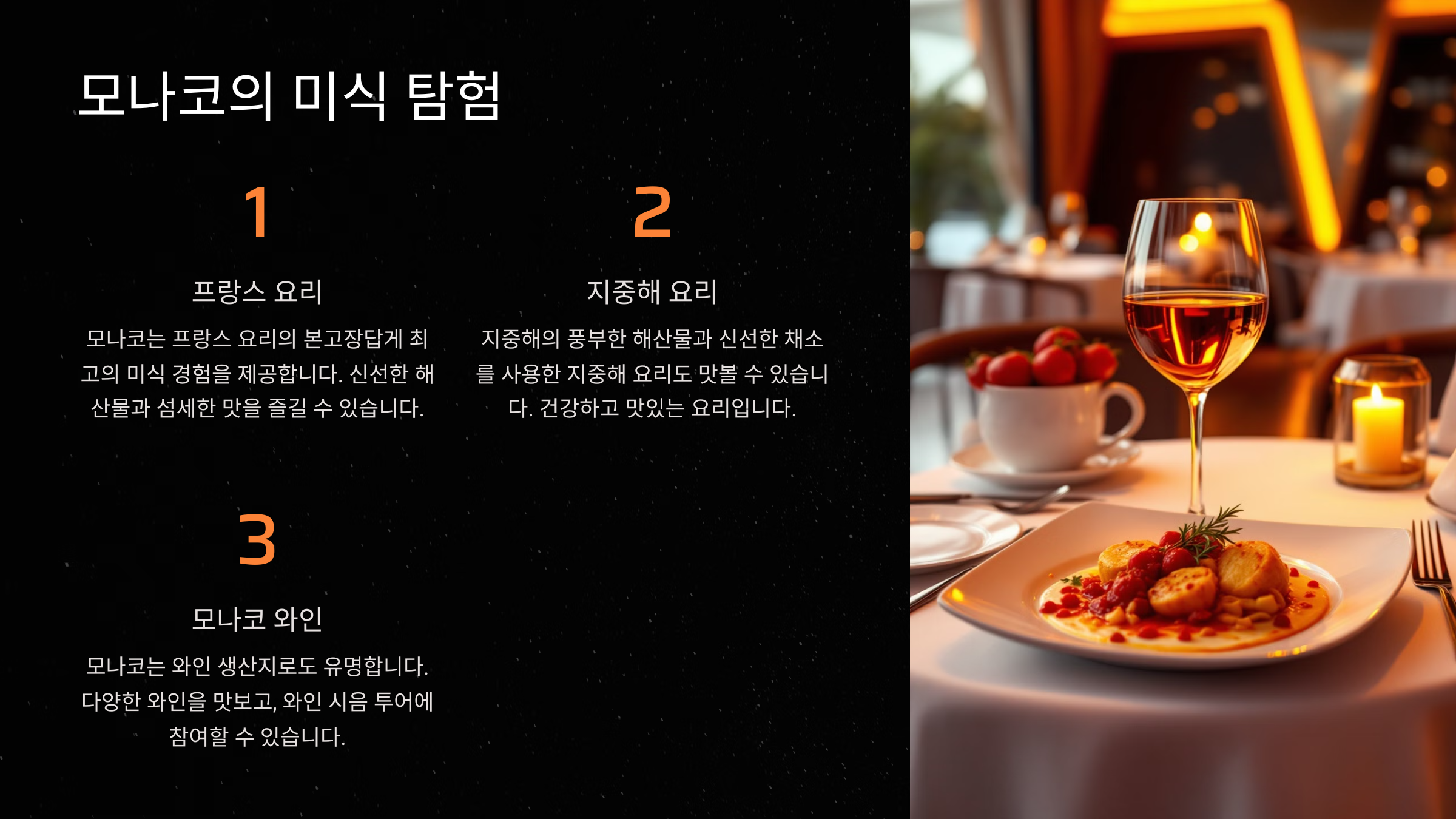모나코는 다양한 미식 경험을 할 수 있는 곳이에요. 이곳의 음식은 프랑스와 이탈리아 요리의 영향을 받아 우아하면서도 독창적인 맛을 자랑해요. 특히 해산물이 신선해서, 지중해 스타일의 요리를 즐기는 사람들에게는 더할 나위 없는 곳이랍니다.