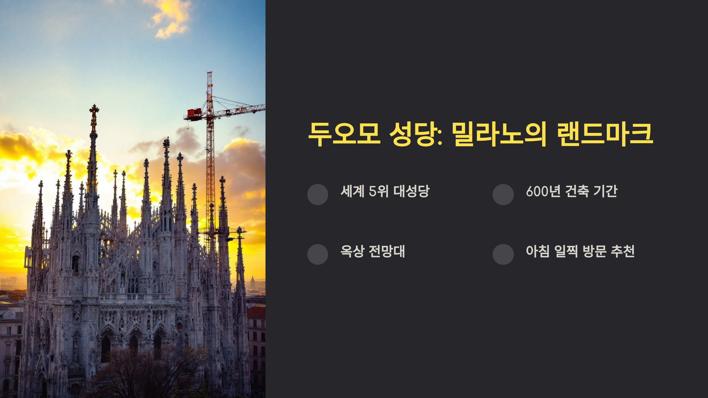 두오모 성당은 밀라노의 상징적인 건축물로, 세계에서 다섯 번째로 큰 대성당입니다.