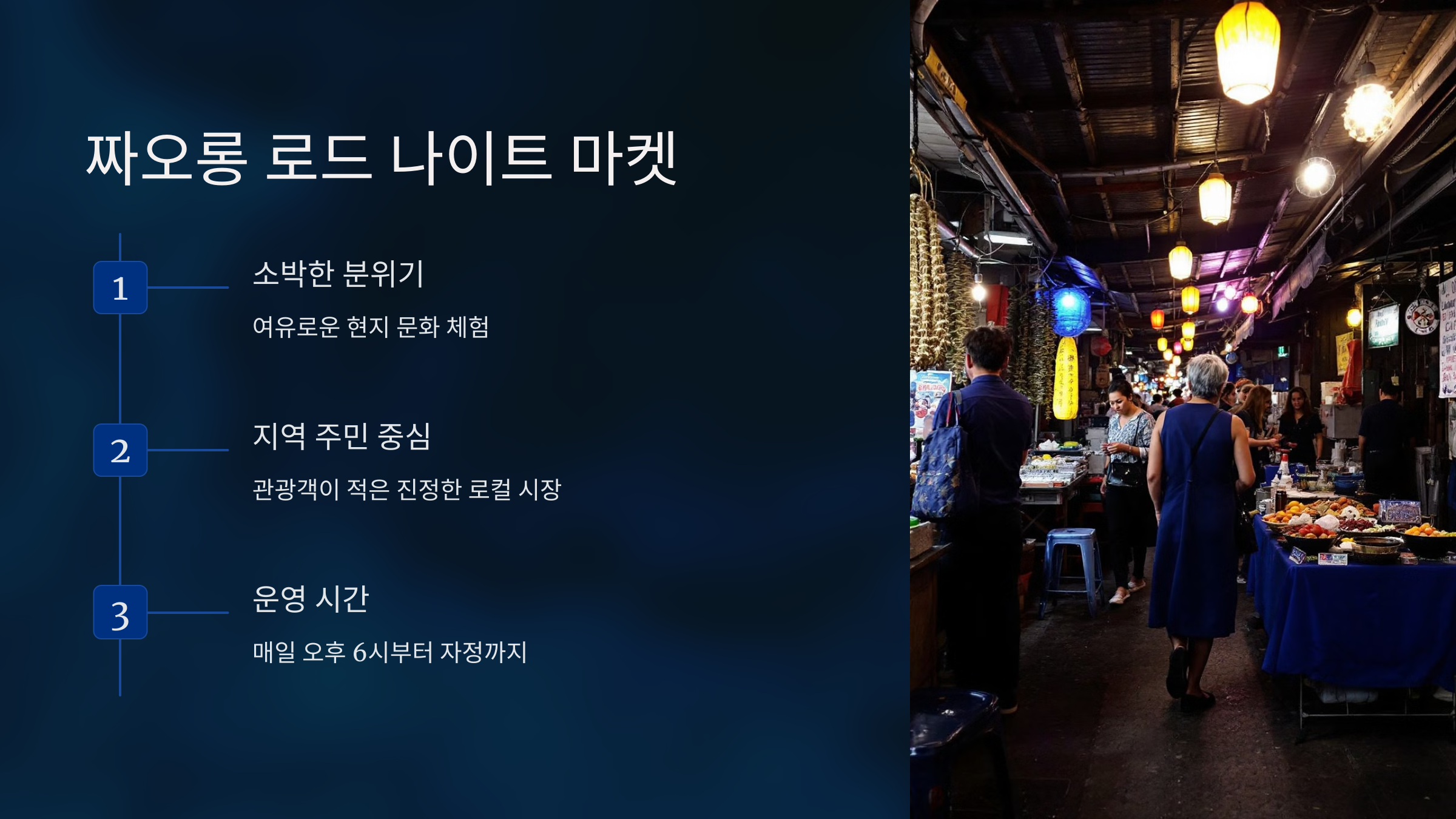 야시장은 보통 오후 5시 이후부터 운영되므로, 해가 진 뒤부터 방문하는 것이 좋습니다.