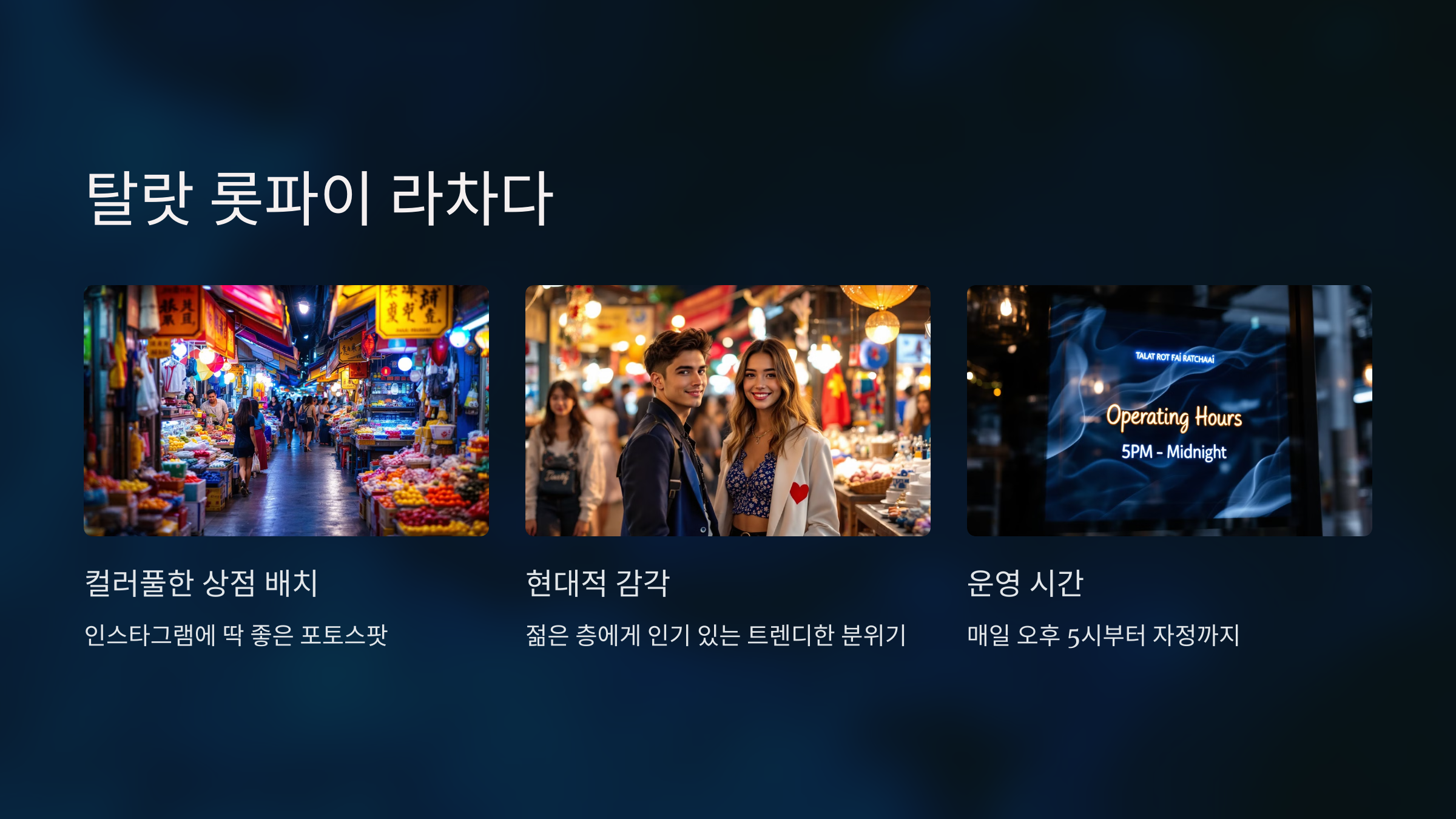 탈랏 롯파이 라차다는 방콕의 현대적인 야시장 중 하나로, 도시적 감각과 전통적인 매력이 어우러진 곳입니다. 컬러풀한 상점들이 일렬로 늘어선 모습이 인상적이며, 사진을 찍기에 매우 좋은 장소입니다.