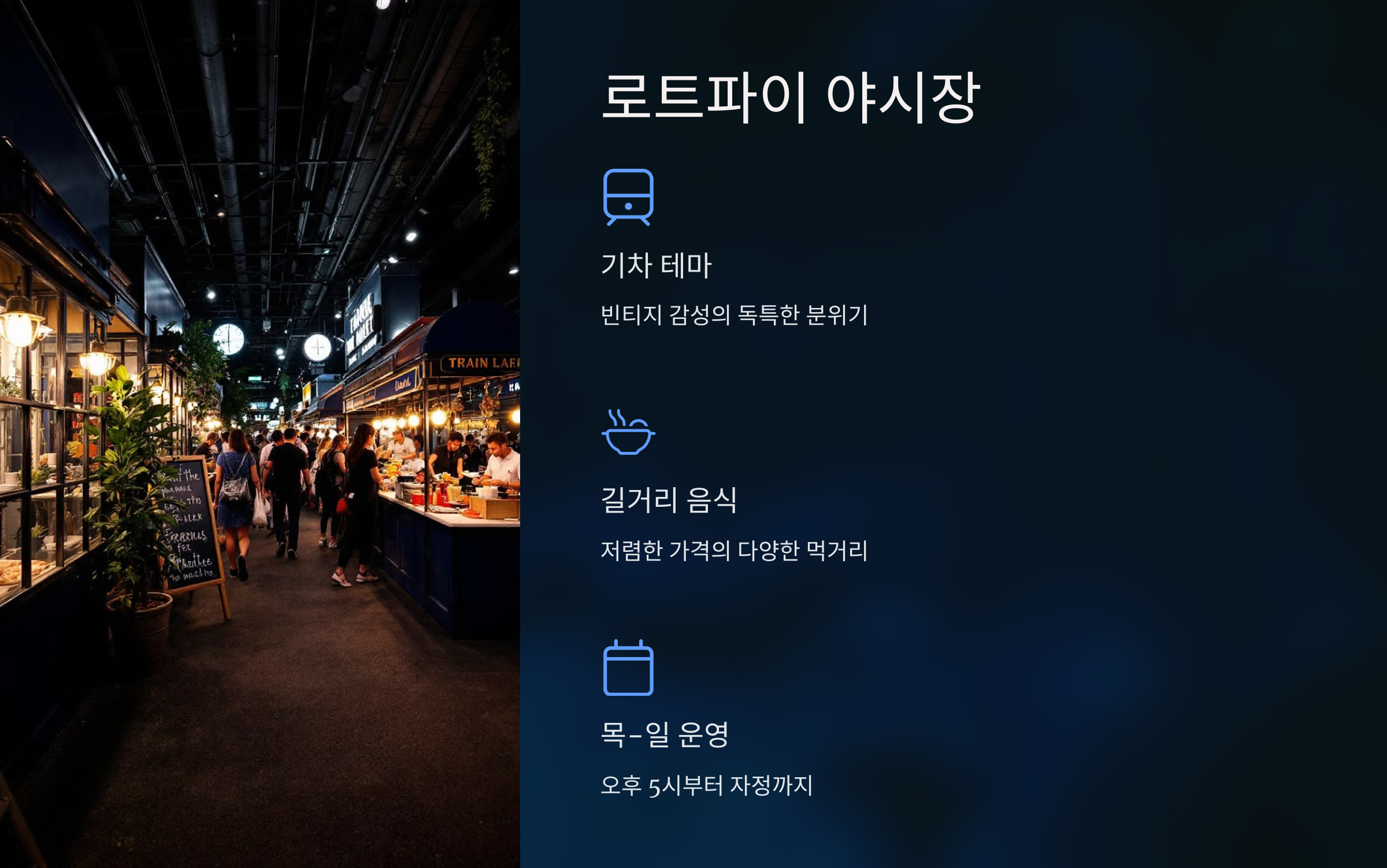 • 운영 시간: 매일 오후 5시 ~ 자정.