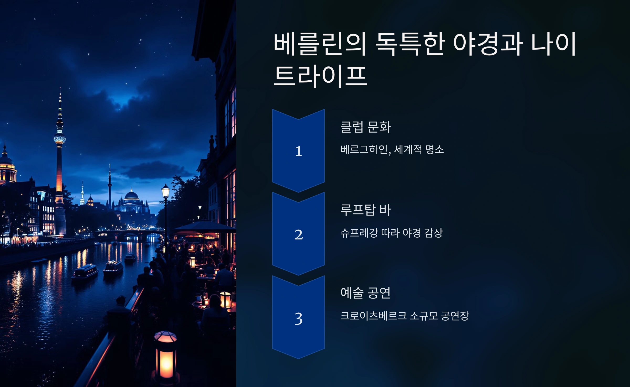 베를린의 밤은 낮만큼이나 활기차고 독특해요. 특히, 베를린은 세계적인 클럽 문화로 유명한 도시로, 베르그하인(Berghain)은 전 세계 클럽 애호가들이 방문하는 성지로 손꼽혀요. 음악과 자유로운 분위기를 즐길 수 있는 다양한 장소들이 준비되어 있답니다.
