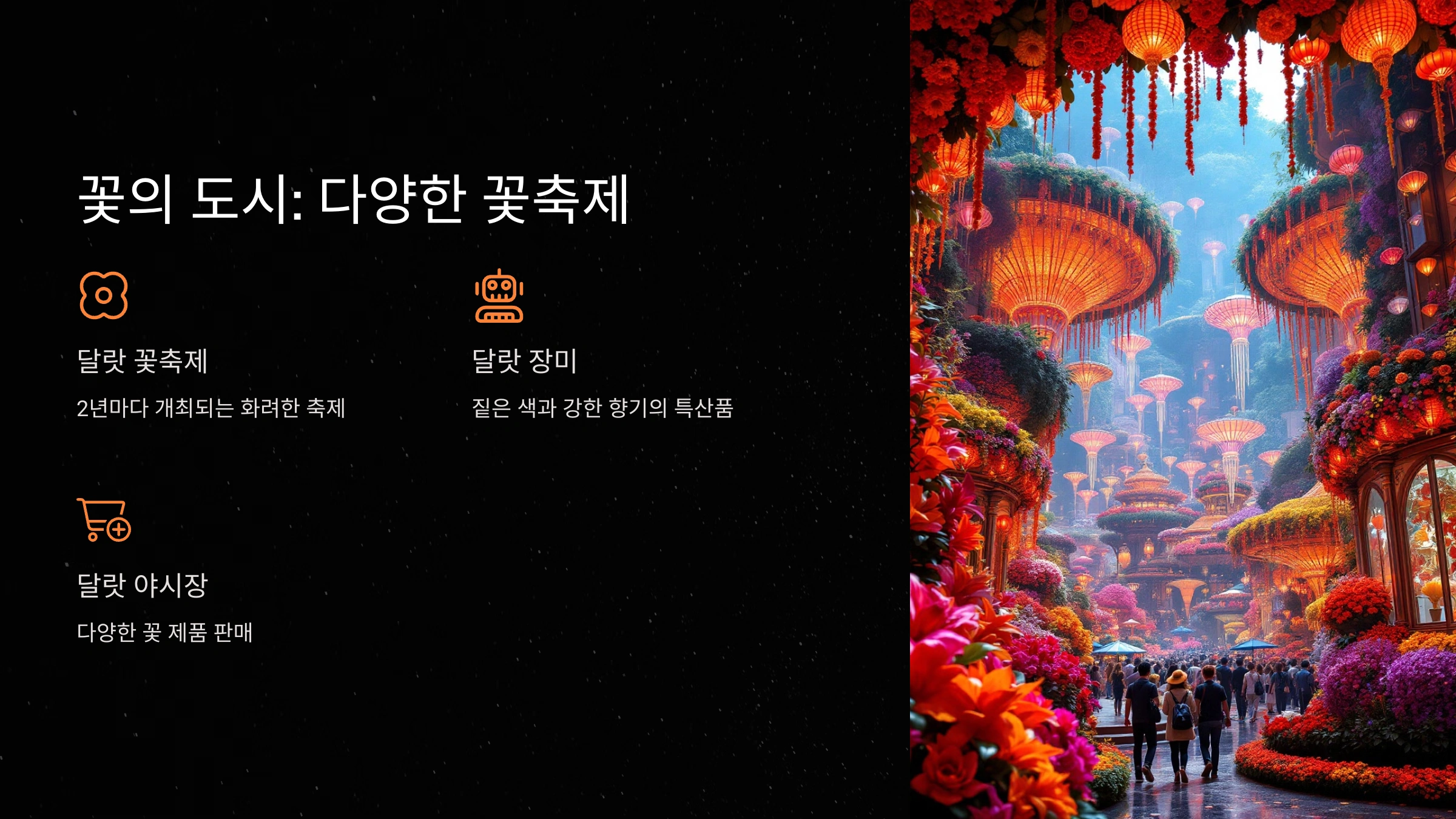 꽃 축제뿐 아니라, 달랏의 꽃 시장도 빼놓을 수 없어요. '달랏 야시장'에서는 신선한 꽃다발뿐만 아니라, 다양한 꽃으로 만든 제품들을 구경하고 구매할 수 있어요. 이곳의 꽃은 단순히 아름다움을 넘어 달랏의 정체성을 상징하고 있어요.