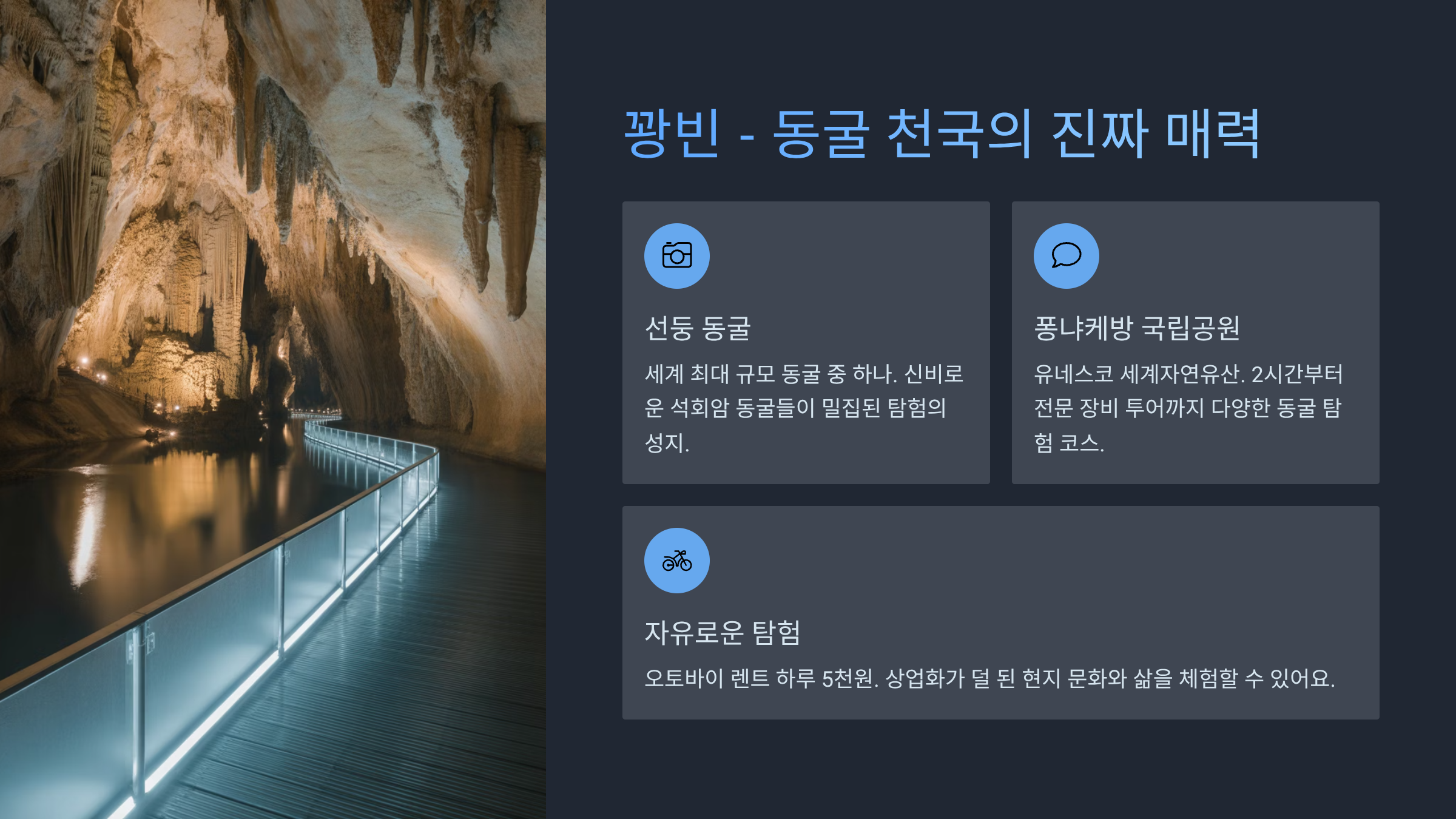 꽝빈은 베트남 중북부에 위치한 조용한 도시예요. 이곳은 세계 최대 규모의 동굴 중 하나인 ‘선둥 동굴(Sơn Đoòng)’을 포함해 수십 개의 신비로운 석회암 동굴이 밀집된 지역으로 유명해요. 자연 그대로의 모습이 잘 보존되어 있어서 탐험 정신이 가득한 여행자들에게 정말 딱이에요.