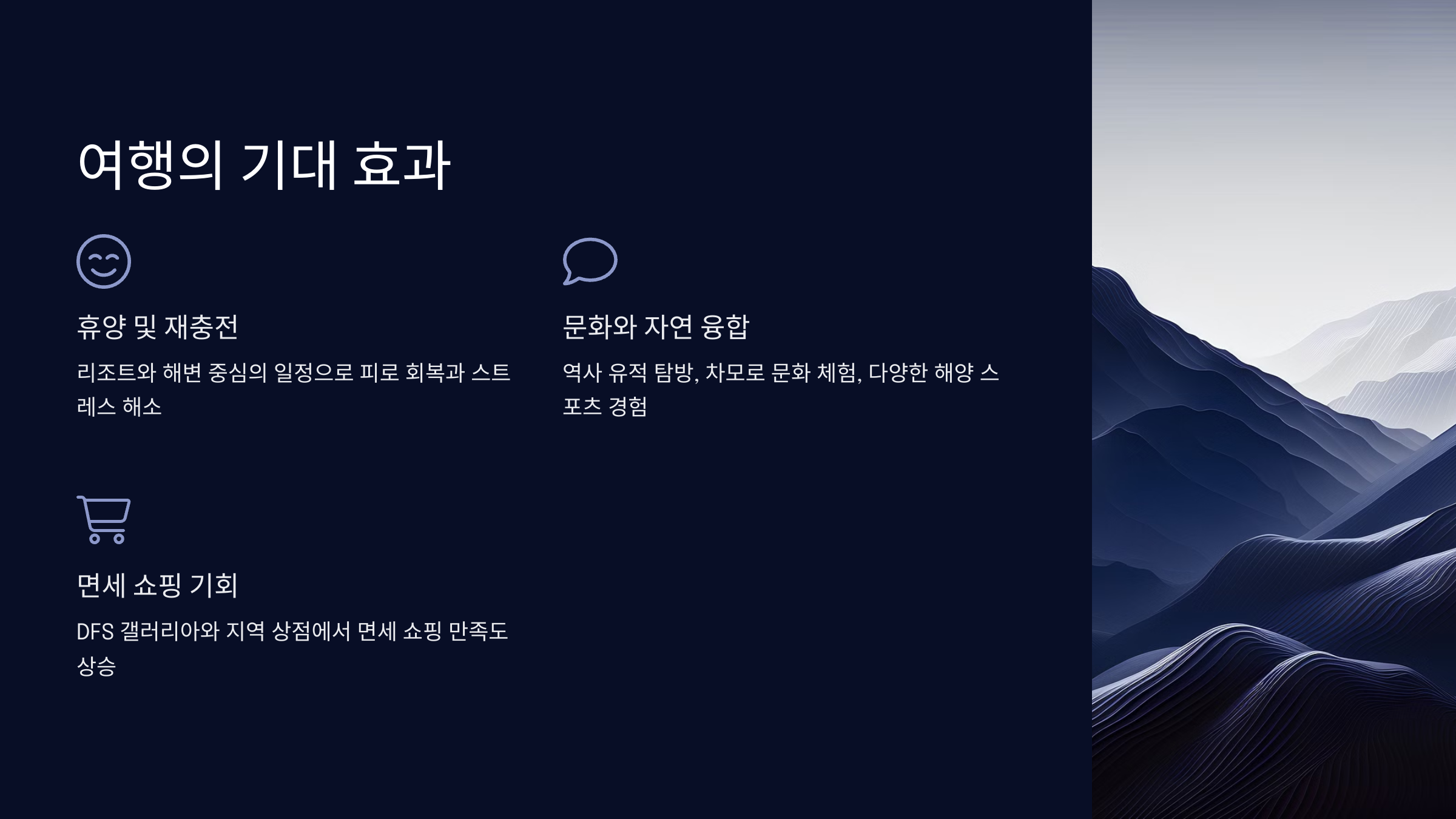 사이판 공항에 도착 후 리조트로 이동하여 여정을 시작합니다. 리조트에 짐을 푼 후, 사이판의 대표적인 관광 명소인 마이크로 비치에서 환상적인 일몰을 감상하며 여행의 설렘을 만끽합니다. 리조트 내 스파 시설을 이용하며 긴 비행의 피로를 풀고, 첫날 저녁은 사이판의 신선한 해산물 요리를 맛보는 것으로 마무리합니다.