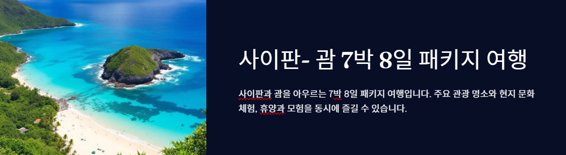 사이판과 괌은 환상적인 태평양의 매력을 느낄 수 있는 두 곳으로, 휴양과 모험, 그리고 독특한 문화 체험이 어우러진 여행지입니다. 7박 8일 동안 이 두 섬의 매력을 모두 체험할 수 있는 패키지 여행은 가족, 연인, 그리고 친구들과 함께 특별한 시간을 보내기 위한 완벽한 선택입니다.