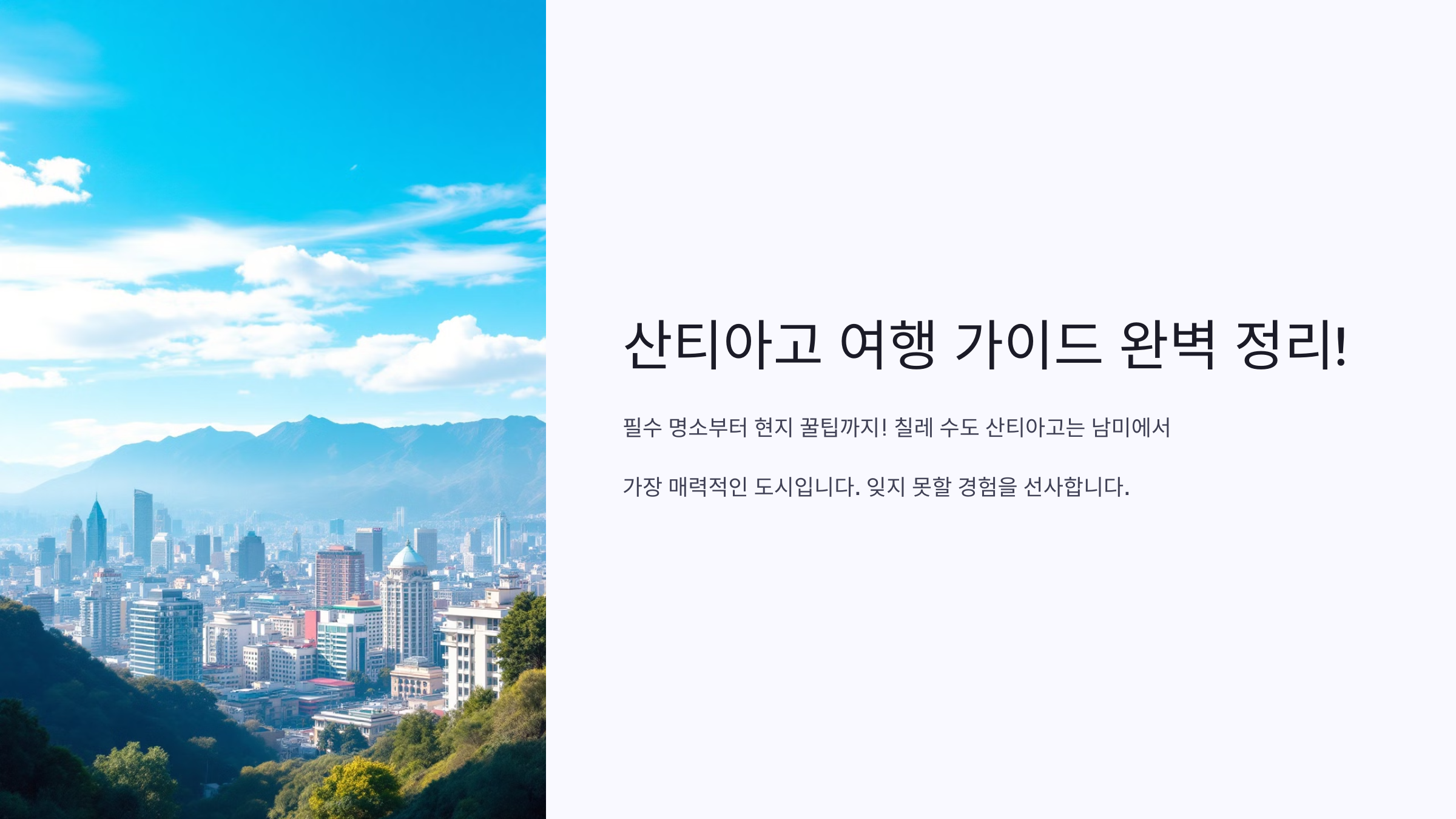 칠레의 수도 **산티아고(Santiago)**는 남미에서 가장 매력적인 도시 중 하나입니다. 안데스 산맥을 배경으로 한 도시의 경관은 감탄을 자아내며, 현대적인 도시 속에서도 식민지 시대의 흔적과 전통적인 문화가 공존하는 곳이죠. 또한, 다양한 예술, 역사, 음식, 자연경관이 한데 어우러져 여행객들에게 잊지 못할 경험을 선사합니다.