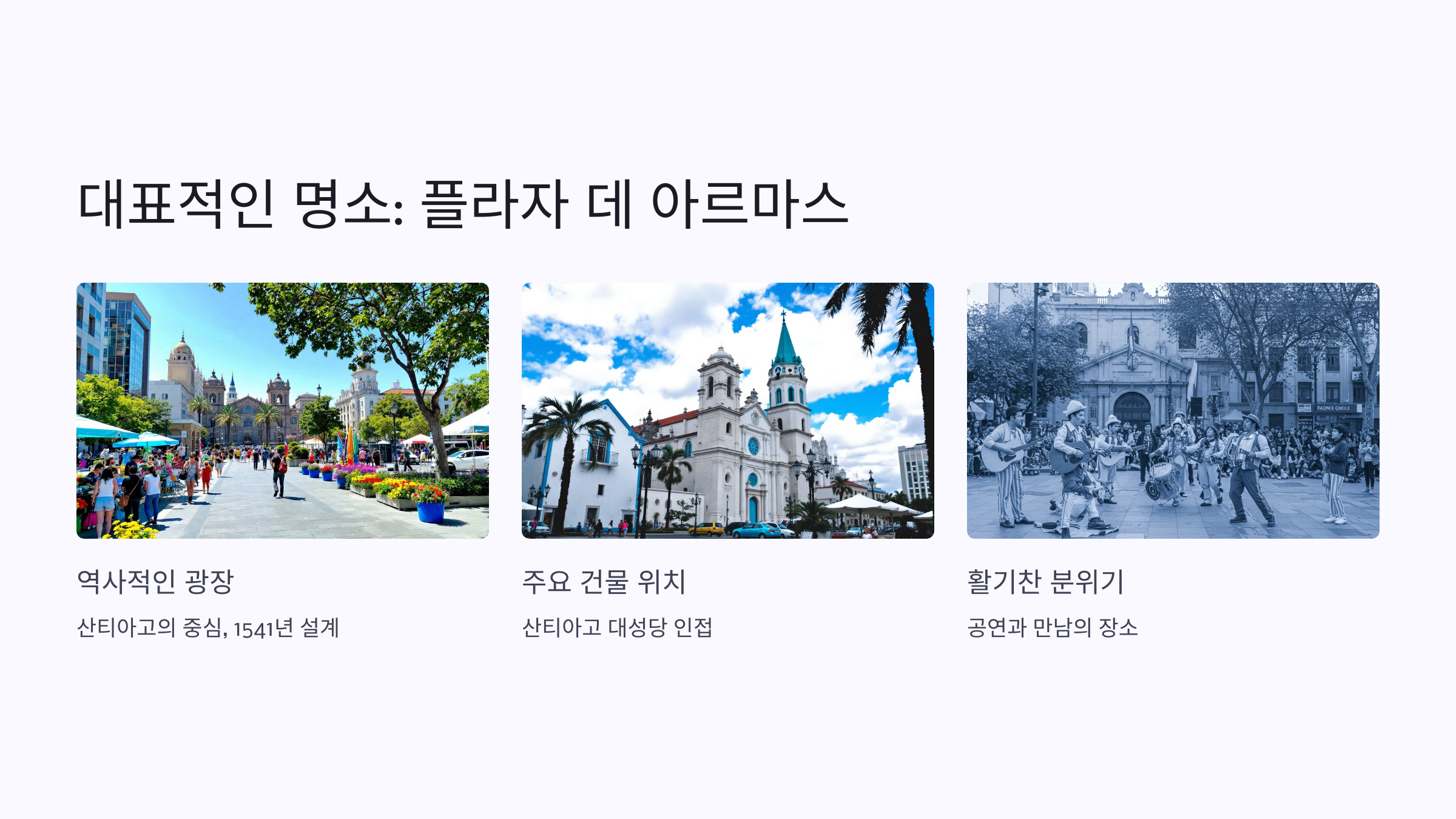 산티아고의 중심 광장으로, 도시의 역사를 느낄 수 있는 곳입니다. 1541년 스페인 정복자들이 도시를 설계하며 만든 곳으로, 광장을 중심으로 주요 건물들이 자리 잡고 있습니다.