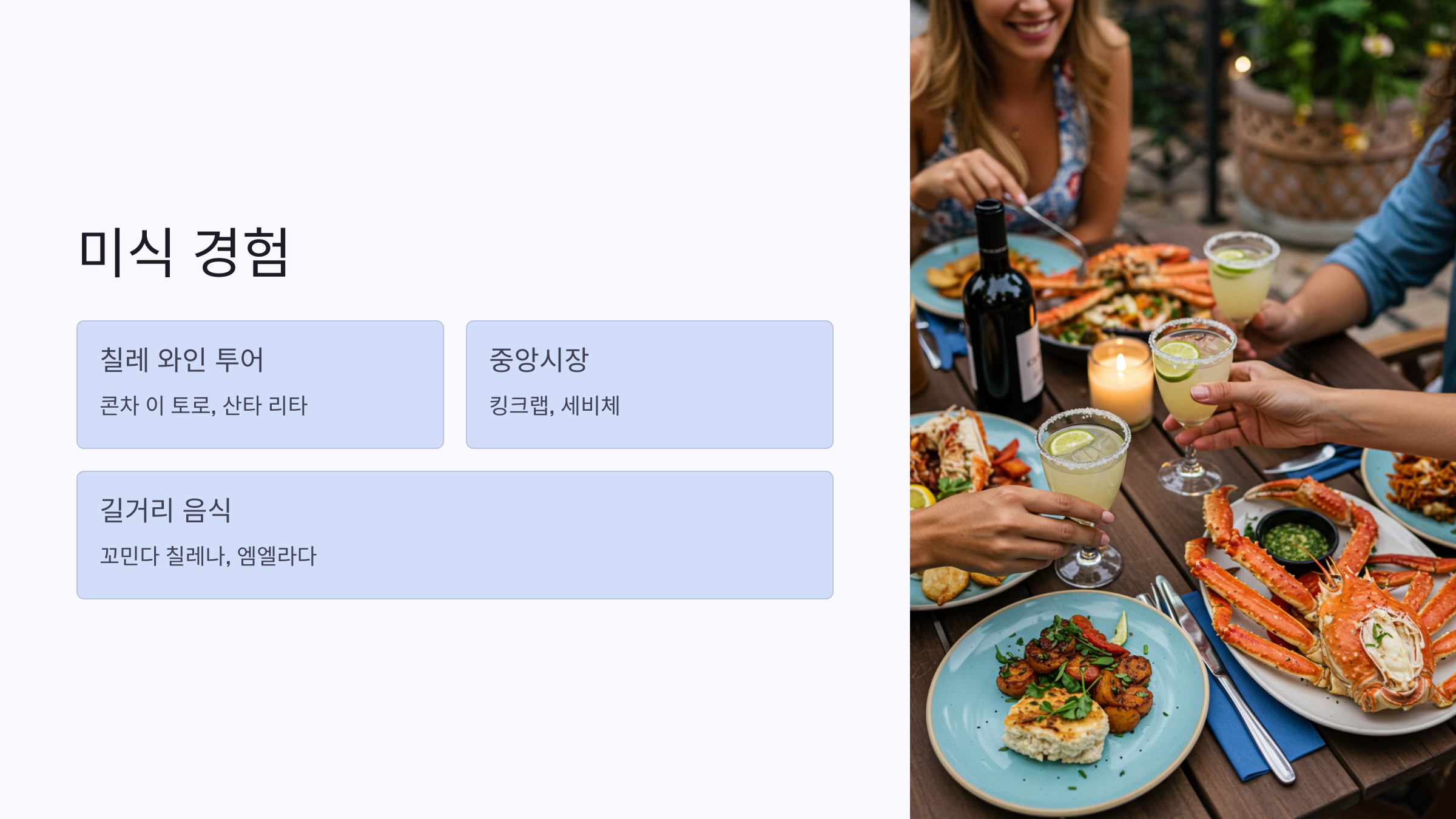 칠레는 해안 국가이기 때문에 신선한 해산물을 쉽게 즐길 수 있습니다. 산티아고의 중앙시장은 특히 **킹크랩(Centolla)**과 세비체(Ceviche) 같은 해산물 요리가 맛있기로 유명합니다.