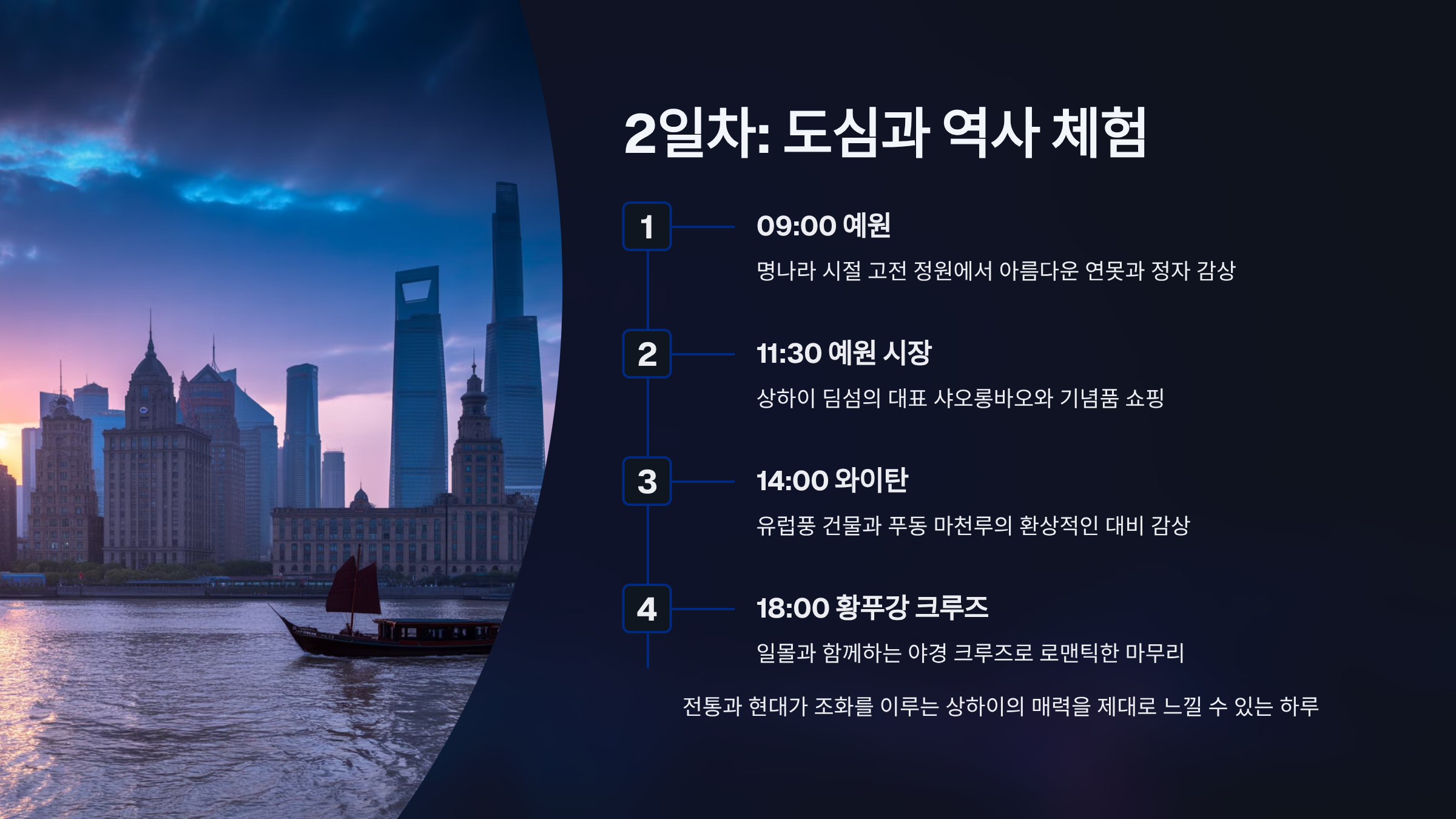 2일차 일정은 도심 속 여유와 문화가 조화를 이루는 날이에요. 아이들에게는 새로운 세계를 보여주고, 어른들에게는 여행의 감성을 충전시켜주는 하루죠. 상하이의 매력을 제대로 느낄 수 있는 루트라서 누구나 만족할 거예요.