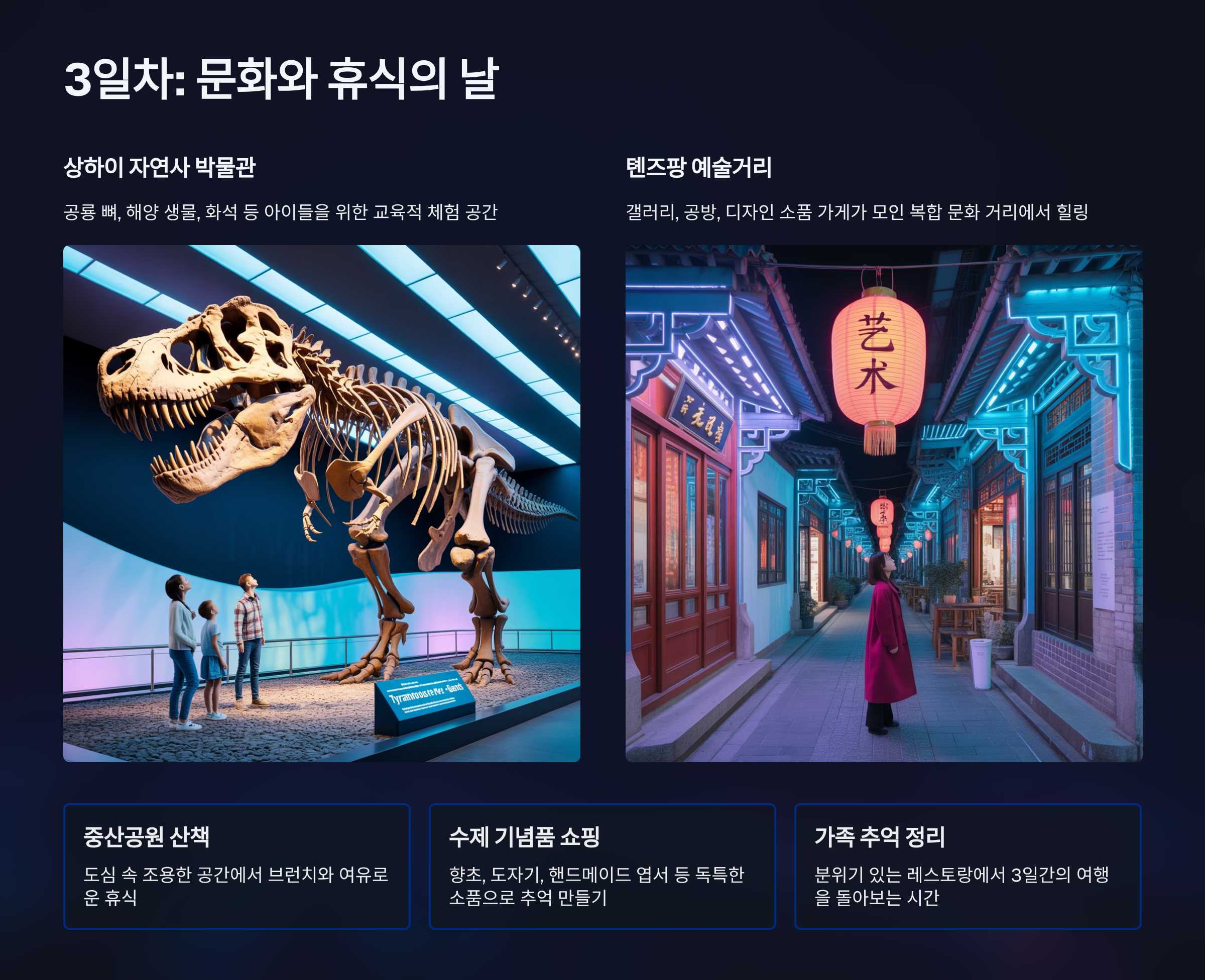상하이 가족여행의 셋째 날은 여유롭게 보내는 걸 추천해요. 빠르게 이동하기보다는 문화와 예술, 힐링이 함께하는 코스를 따라가면 가족 모두가 만족할 수 있답니다. 특히 이날은 부모님도 좋아하시고, 아이들도 즐길 수 있는 활동 위주로 구성해봤어요 😊