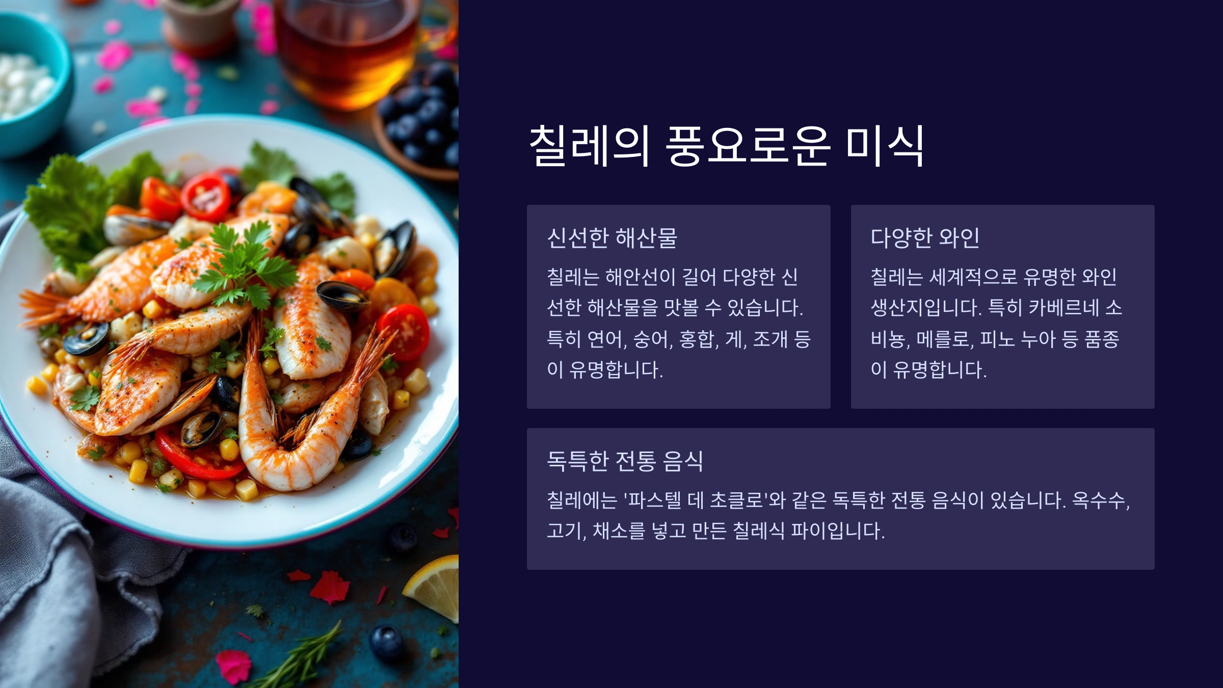 칠레 음식은 바다와 산, 그리고 다양한 기후 조건에서 얻은 재료를 활용해 독창적이고 맛깔스러운 요리로 유명해요. 특히 태평양에 접해 있는 덕분에 신선한 해산물을 풍부하게 즐길 수 있답니다.