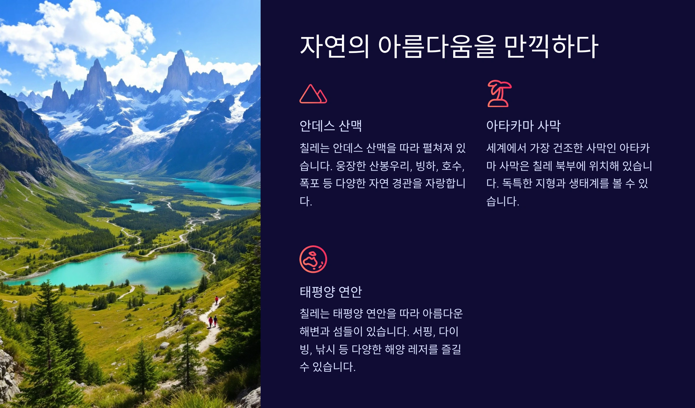 칠레의 지리적 특징은 세계적으로도 매우 독특해요. 국토가 길고 좁아서 북쪽에서 남쪽까지 기후와 환경이 극단적으로 달라요. 북쪽은 세계에서 가장 건조한 사막인 아타카마 사막이 있고, 남쪽으로 갈수록 빙하와 숲이 펼쳐져 있어요. 이처럼 다양한 환경이 조화를 이루며 자연적 다양성을 자랑해요.