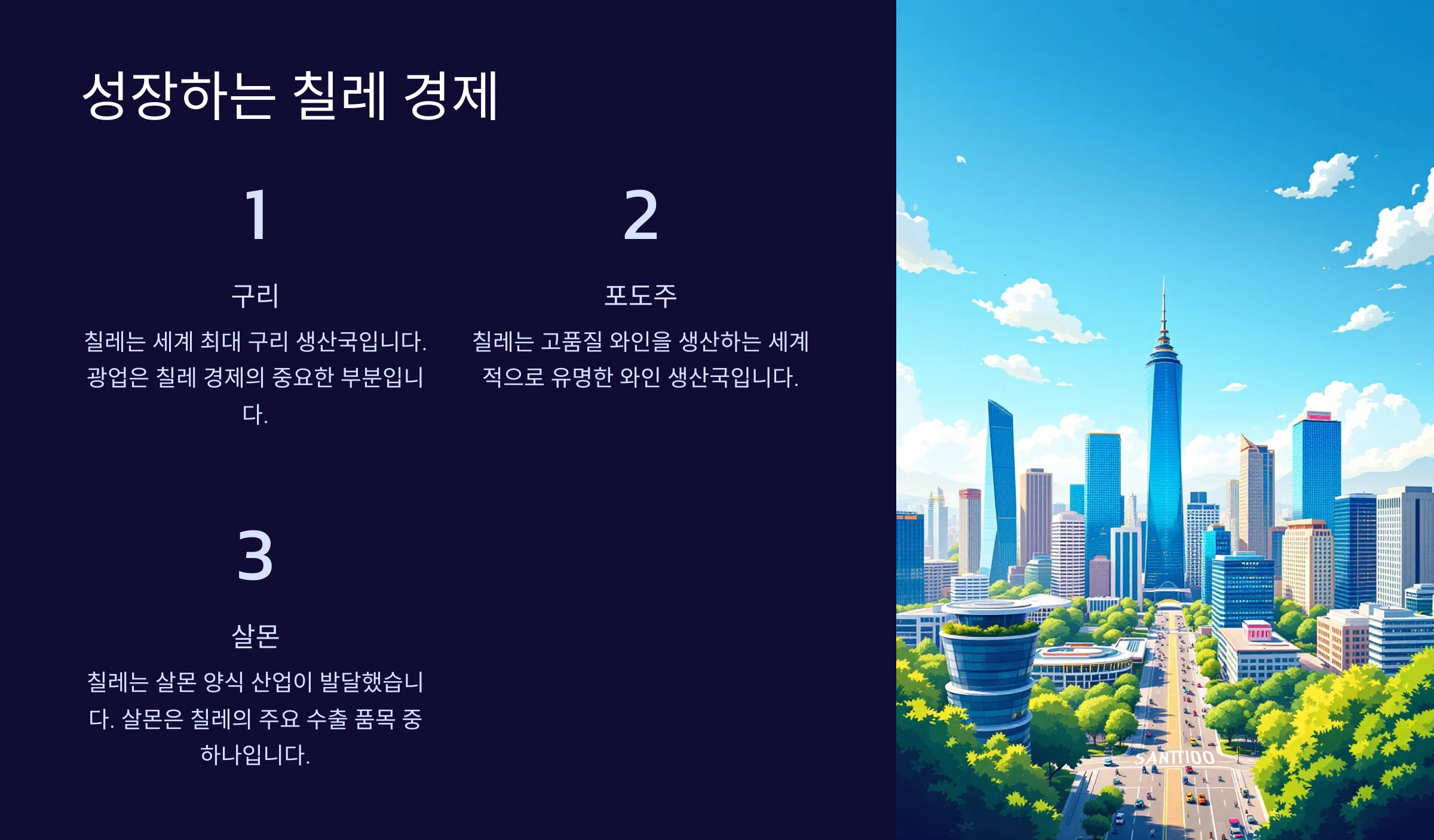칠레는 라틴 아메리카에서 경제적으로 가장 안정적인 나라 중 하나예요. 구리 생산량이 세계 1위를 기록할 만큼 풍부한 천연자원을 보유하고 있으며, 이로 인해 '구리의 나라'라고도 불려요. 광업은 칠레 경제의 핵심이랍니다.
