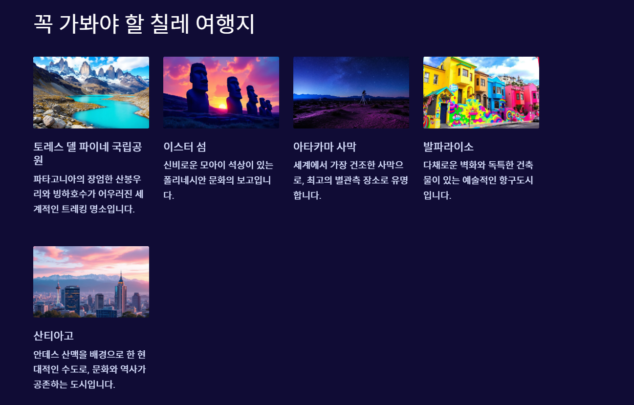 칠레는 다양한 명소가 가득한 나라예요. 북쪽의 아타카마 사막에서는 세계에서 가장 건조한 환경 속에서 별 관측과 독특한 풍경을 경험할 수 있어요. 이곳의 엘 타티오 간헐천은 특히 새벽 시간에 방문하면 경이로운 장관을 보여줘요.