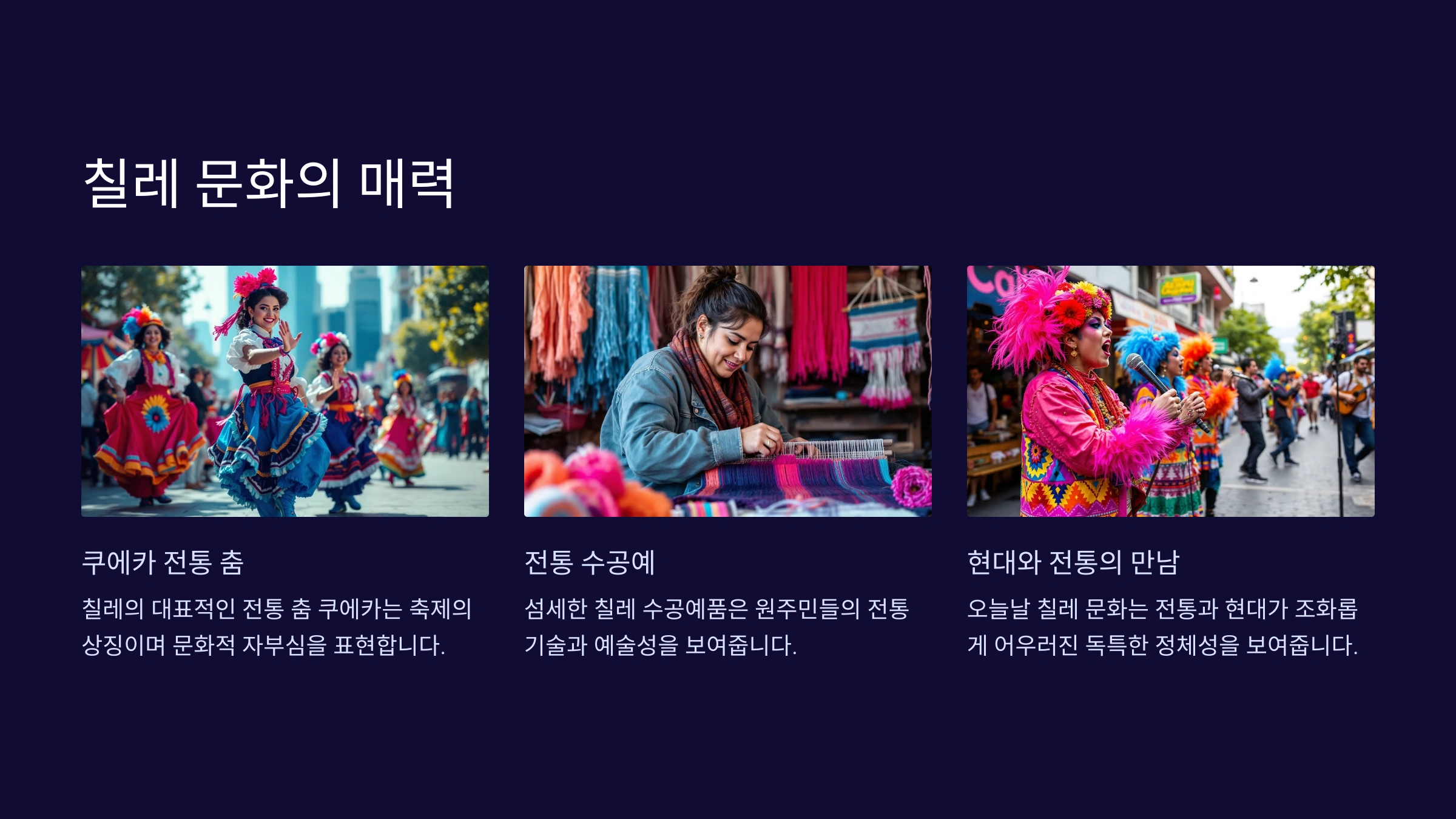 칠레의 문화는 원주민의 전통과 유럽 식민지 문화가 혼합된 독특한 양상을 보여줘요. 특히 마푸체족의 유산은 오늘날까지도 칠레 사회 전반에 큰 영향을 미치고 있어요. 전통 음악, 춤, 그리고 의식까지 그들의 문화는 보존되고 있답니다.
