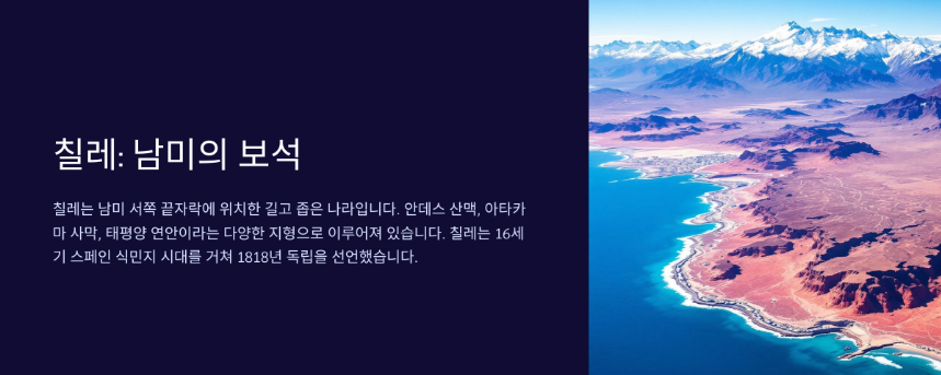 칠레는 남아메리카 대륙의 서쪽 끝, 안데스산맥과 태평양 사이에 자리 잡은 독특한 나라예요. 북쪽의 건조한 아타카마 사막부터 남쪽의 파타고니아 빙하 지역까지, 4300km에 달하는 긴 국토는 마치 지구의 축소판 같아요.