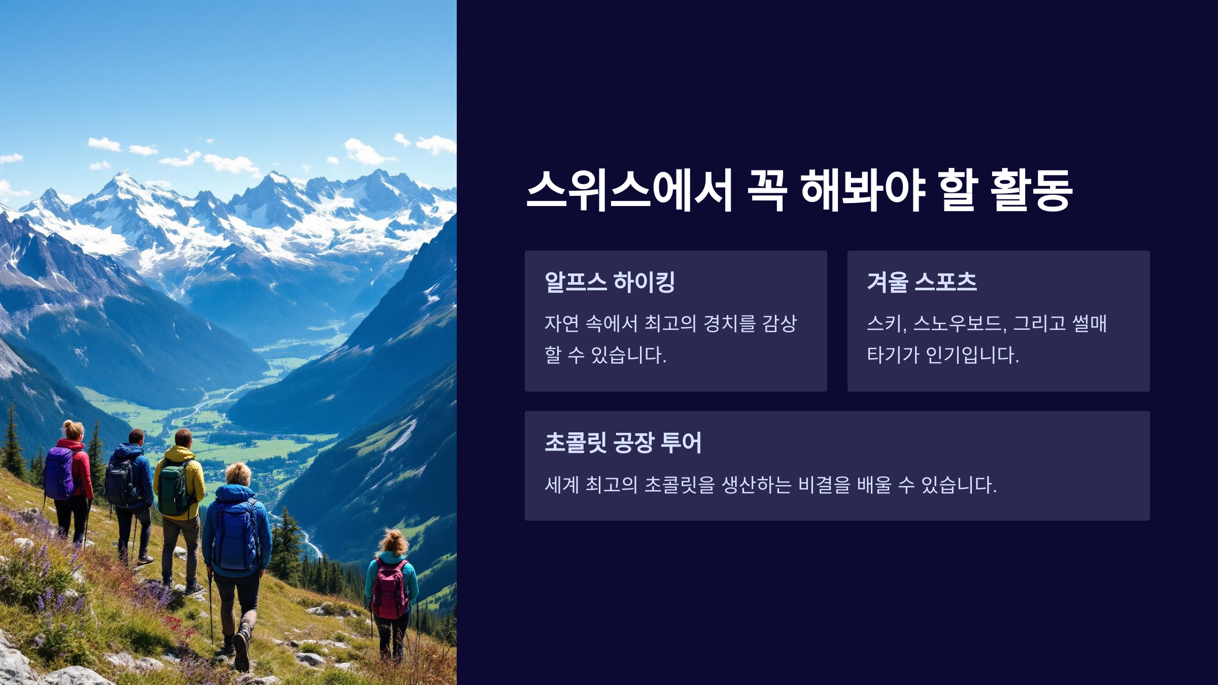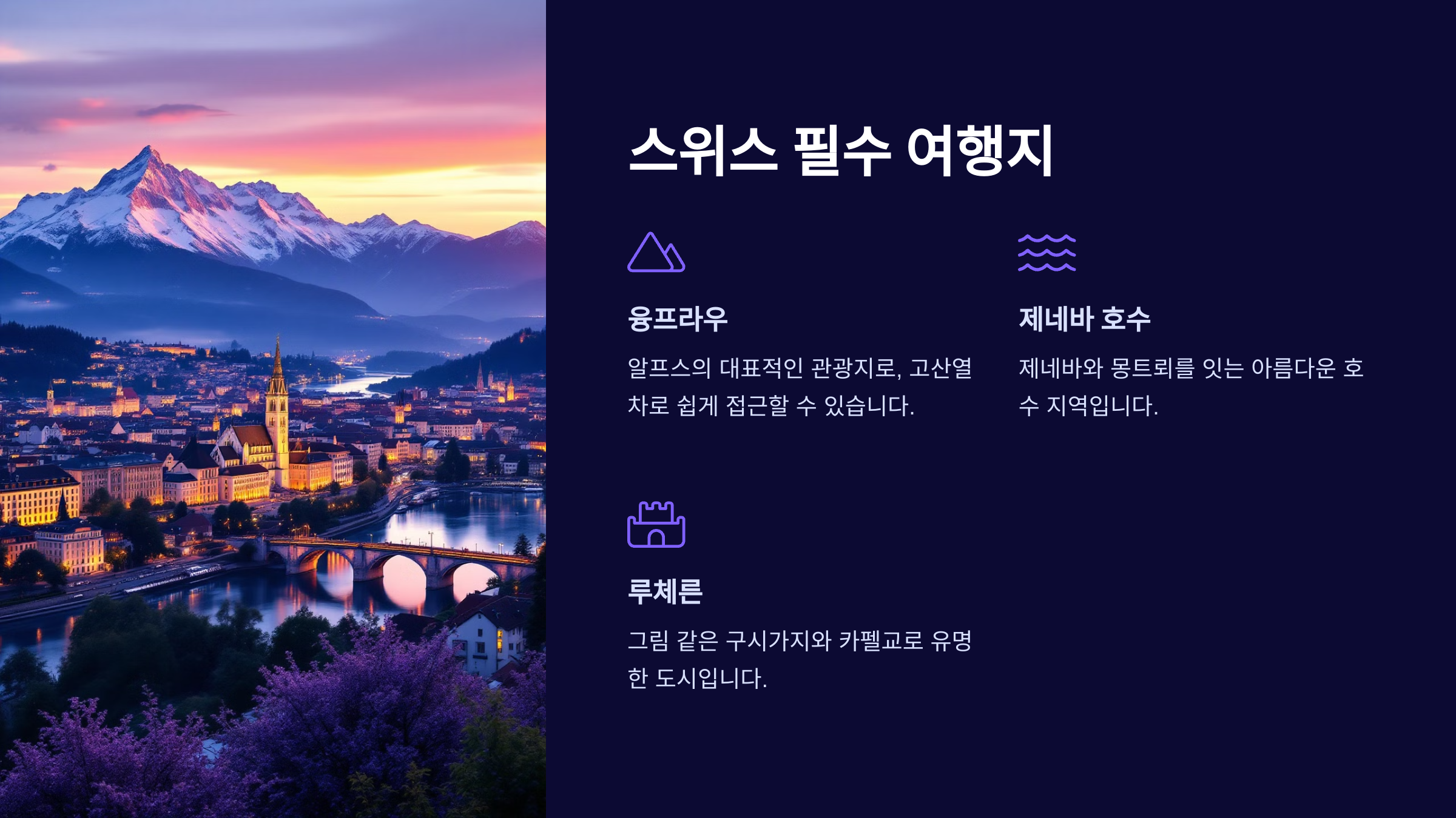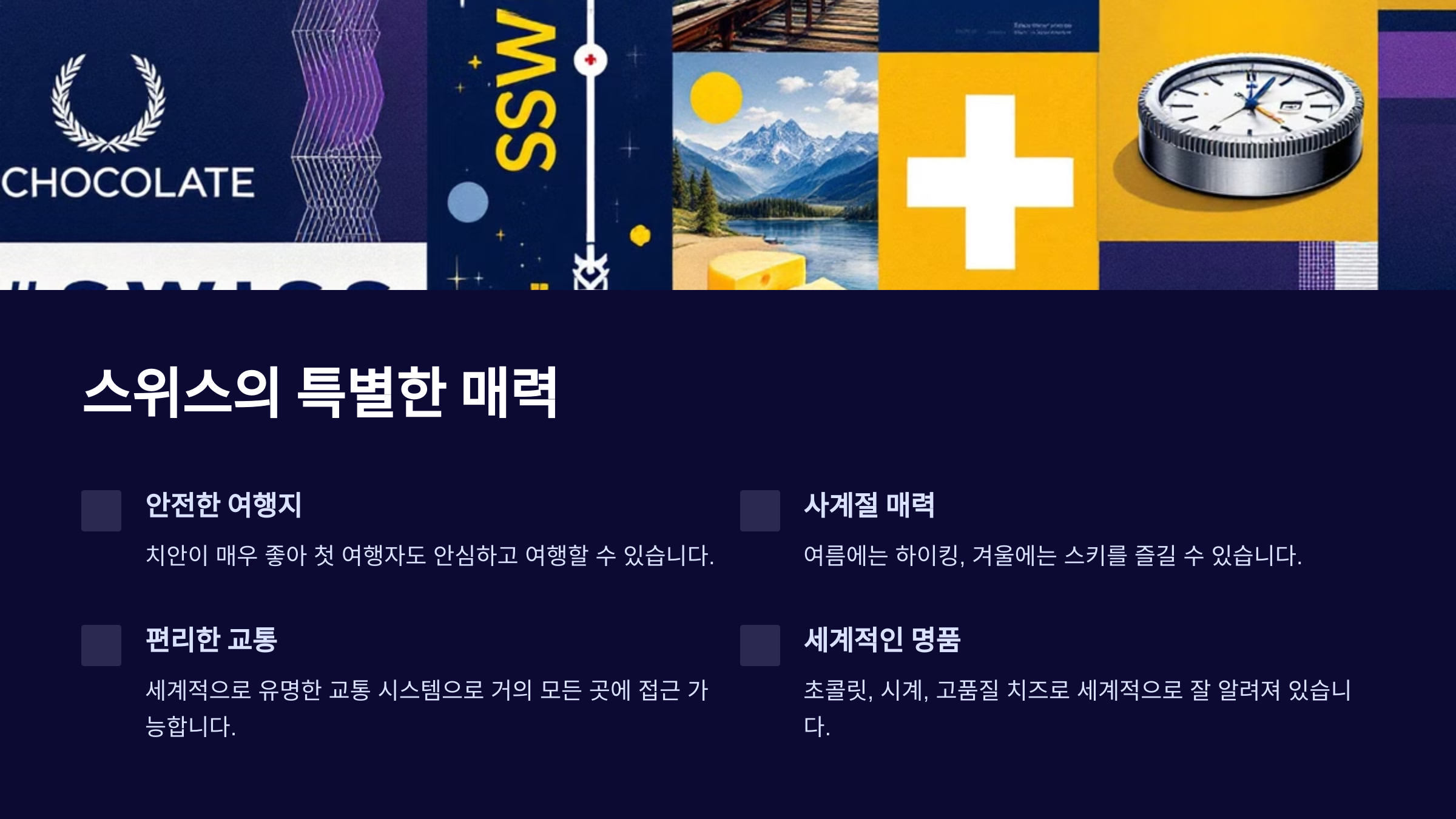 이 모든 요소들이 스위스를 여행지로서 특별하게 만듭니다.