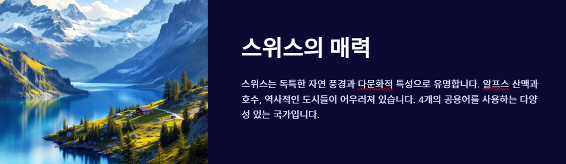 스위스는 알프스 산맥과 호수가 만들어내는 독특한 자연 풍경으로 유명합니다.