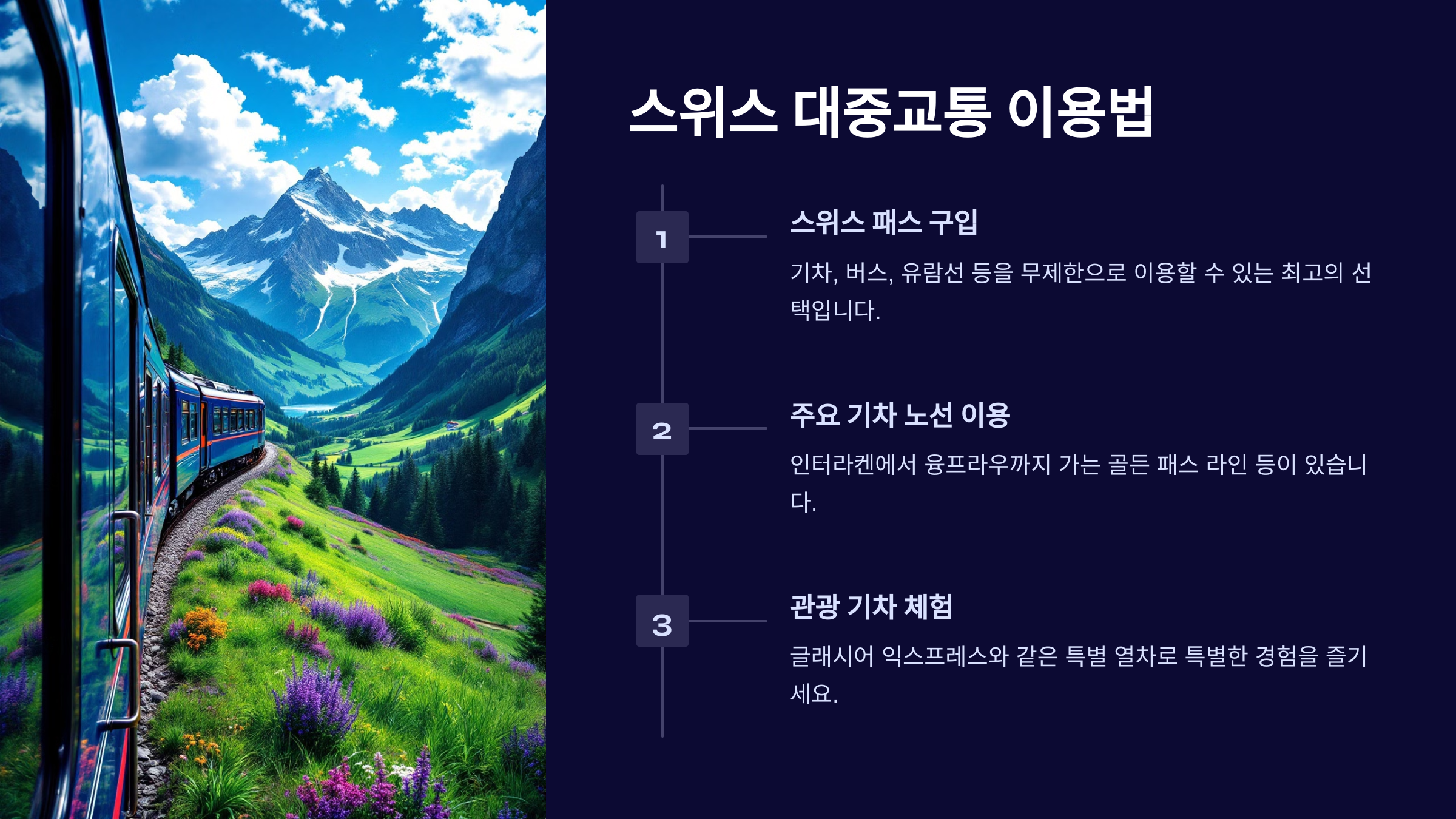 스위스의 대중교통은 철저히 계획적이며 정시 운행으로 유명합니다.