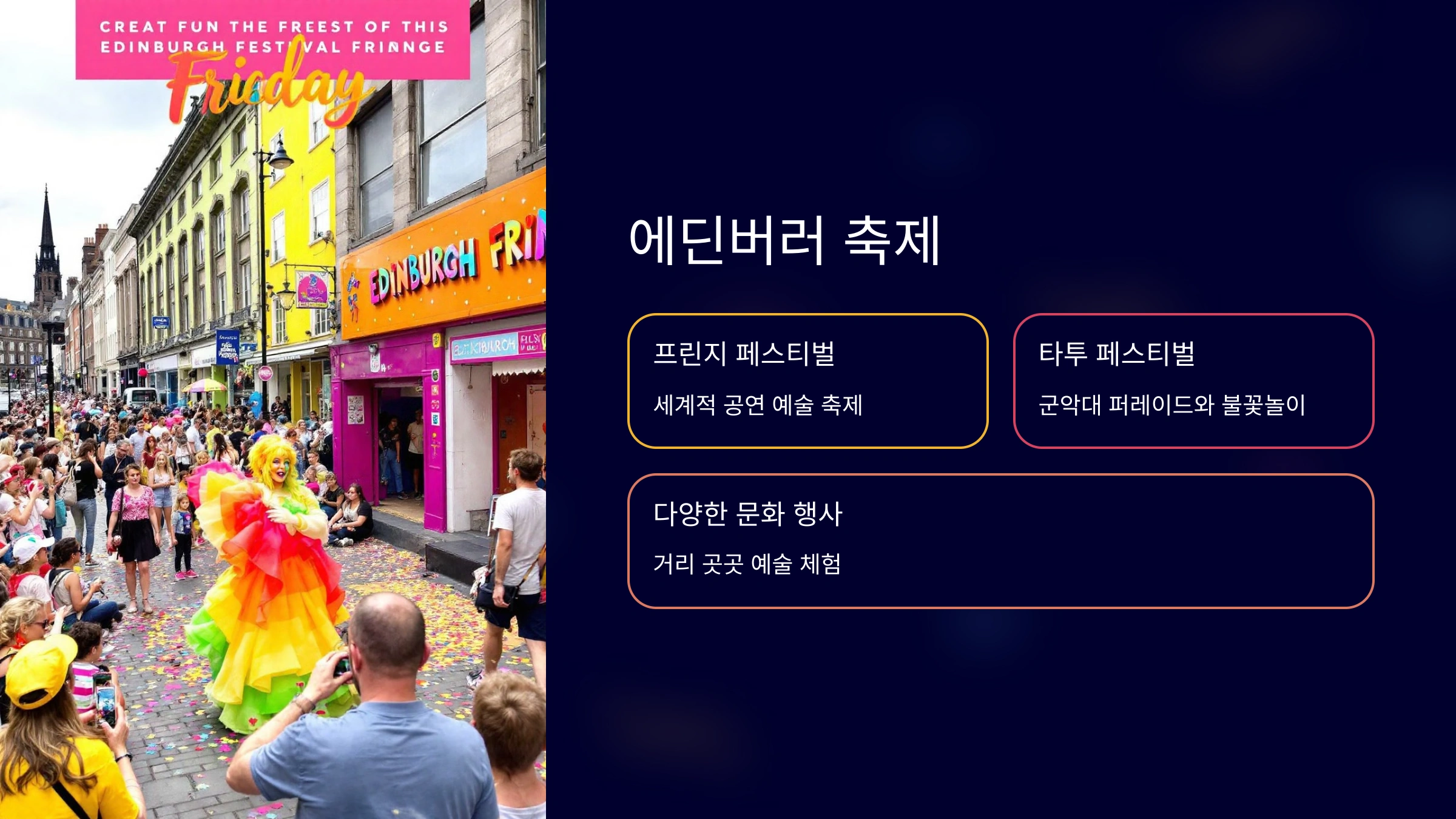 에딘버러 축제는 매년 여름에 열리며, 전 세계적으로 유명한 문화와 예술 축제입니다.