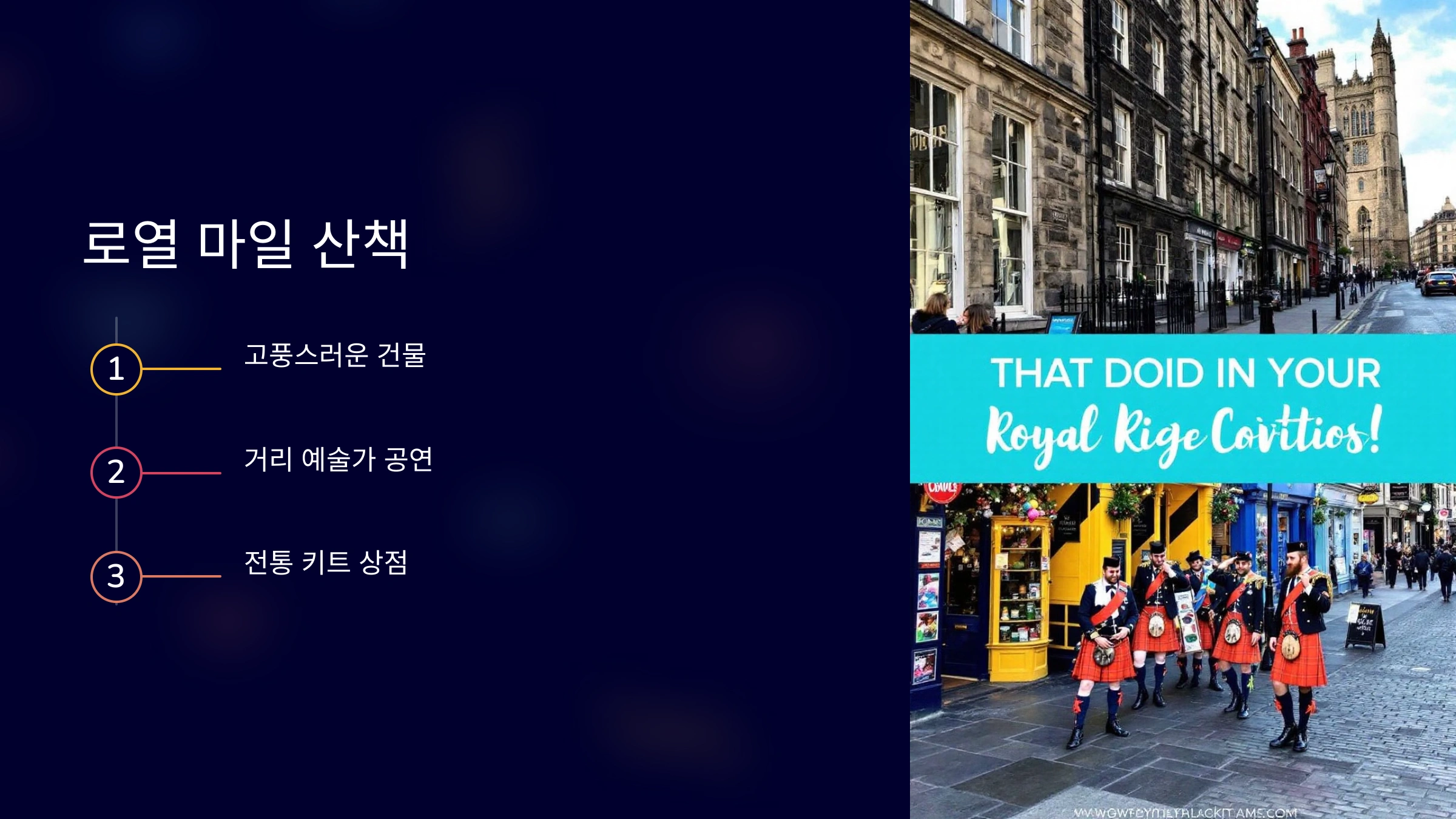 로열 마일은 에딘버러 성에서 홀리루드 궁전까지 이어지는 거리로, 역사적인 분위기를 만끽할 수 있는 곳입니다.