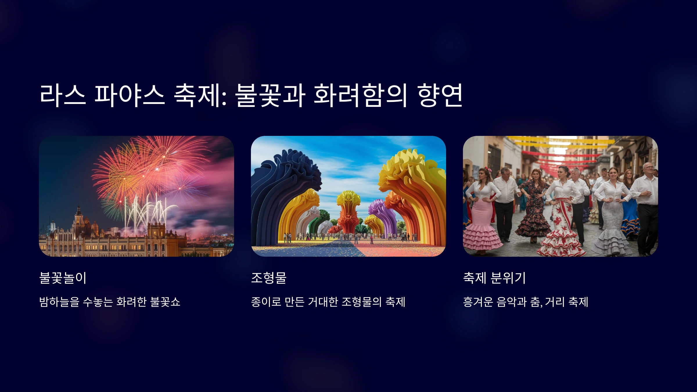 라스 파야스는 단순히 조각상만 있는 것이 아니에요. 퍼레이드, 불꽃놀이, 전통 음악, 춤 등 다양한 이벤트가 함께 어우러져 축제 분위기를 더해줘요. 특히, 지역 주민들이 전통 의상을 입고 행진하는 모습은 이 축제의 하이라이트 중 하나예요.