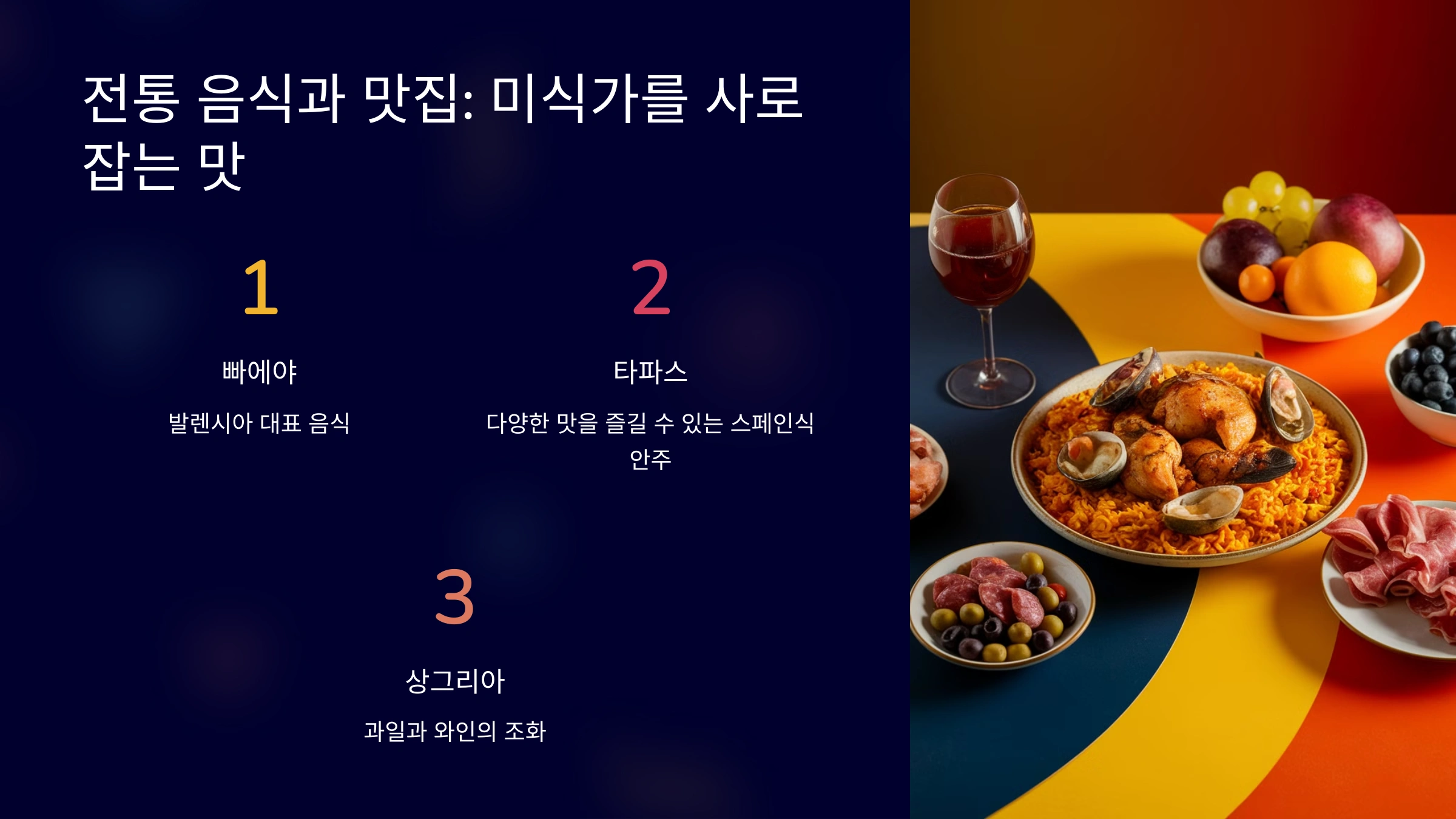 발렌시아는 스페인 요리의 진수를 맛볼 수 있는 곳으로, 특히 전통 음식인 파에야(paella)의 발상지로 유명해요. 파에야는 쌀, 사프란, 해산물 또는 고기를 기본 재료로 사용해 지중해의 풍미를 담아낸 요리랍니다. 현지 레스토랑에서는 파에야를 더욱 맛있게 즐길 수 있어요.