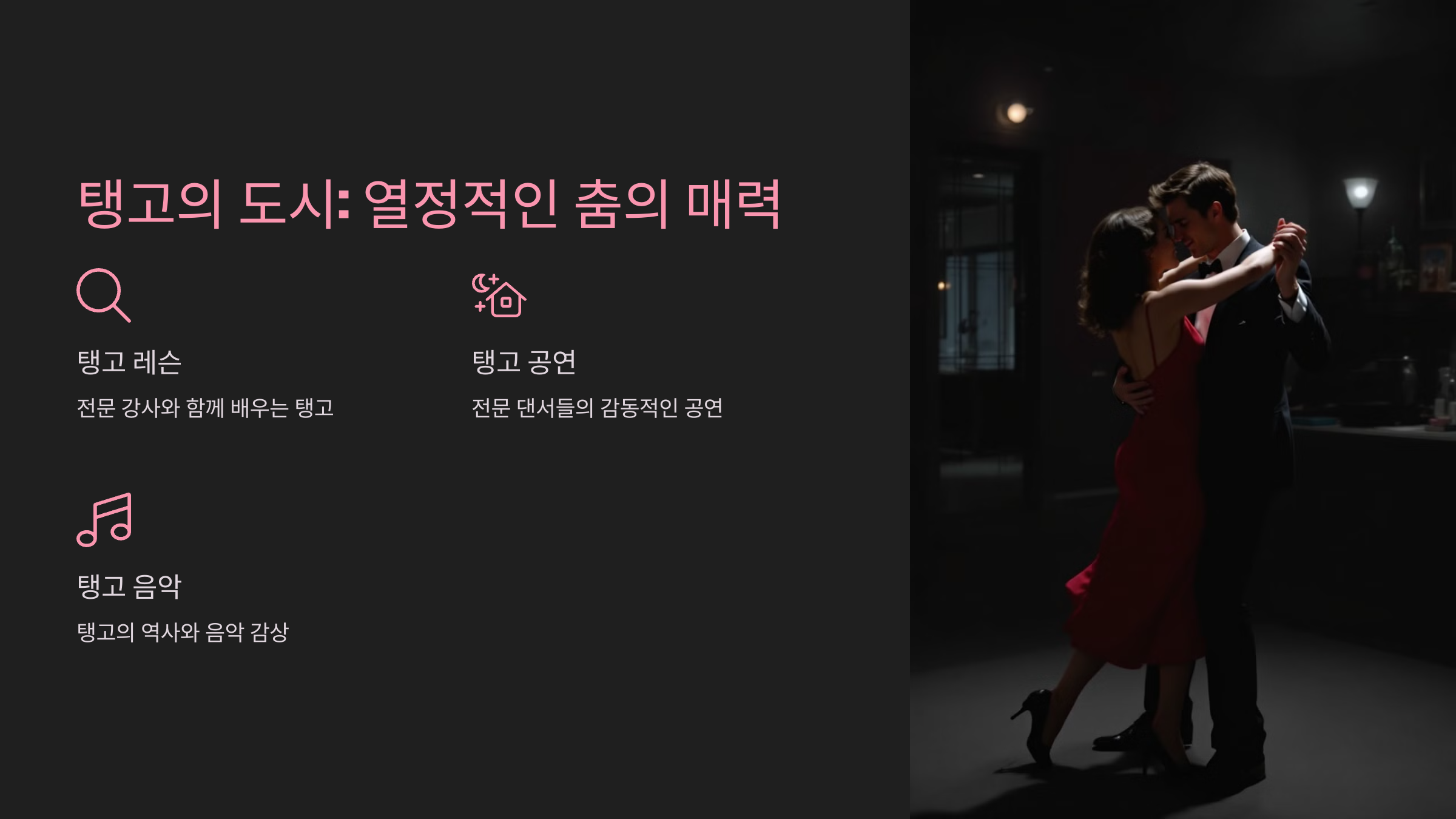 탱고는 아르헨티나의 상징적인 문화 중 하나로, 부에노스아이레스는 그 중심지예요. 도시 곳곳에서는 탱고 공연을 관람하거나 직접 배울 수 있는 기회가 많아요. 탱고는 단순히 춤이 아니라, 그 자체로 열정과 감정을 표현하는 예술이에요.