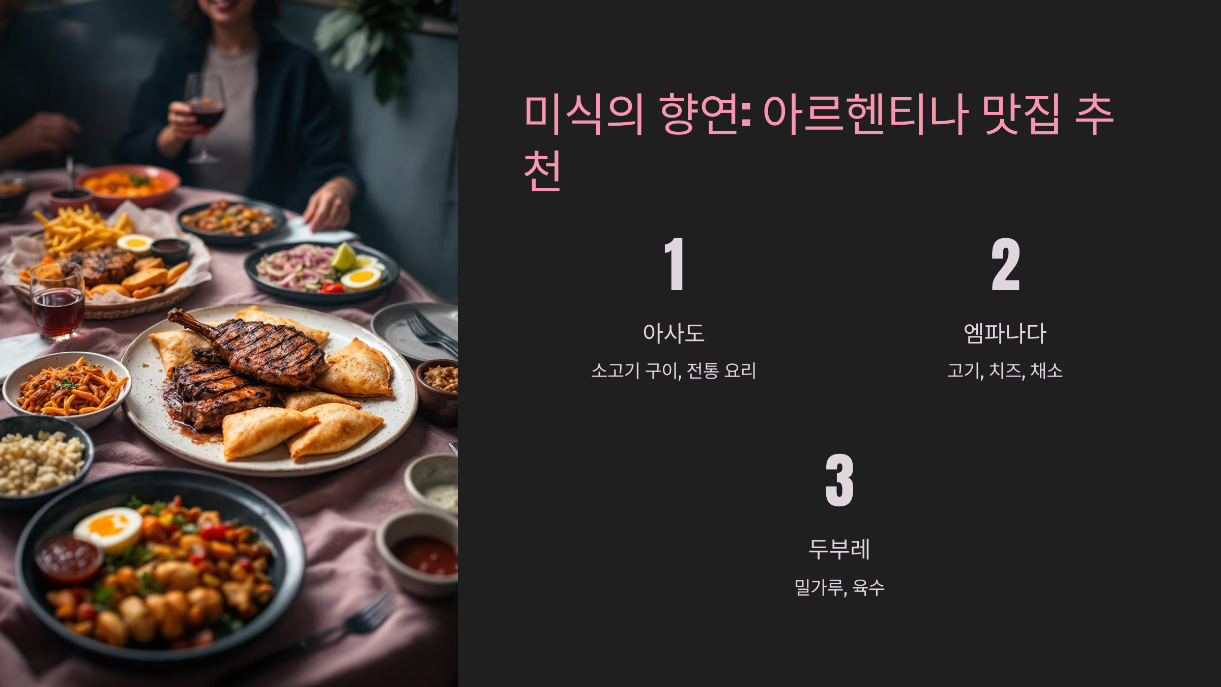 아르헨티나를 여행하면서 현지 음식을 맛보는 것은 놓칠 수 없는 경험이에요. 대표적인 요리로는 아사도(Asado)가 있는데, 이는 석쇠에 구운 고기로, 육즙이 가득한 아르헨티나식 BBQ예요. 부드러운 고기의 풍미는 여행자들에게 큰 인기를 끌어요.
